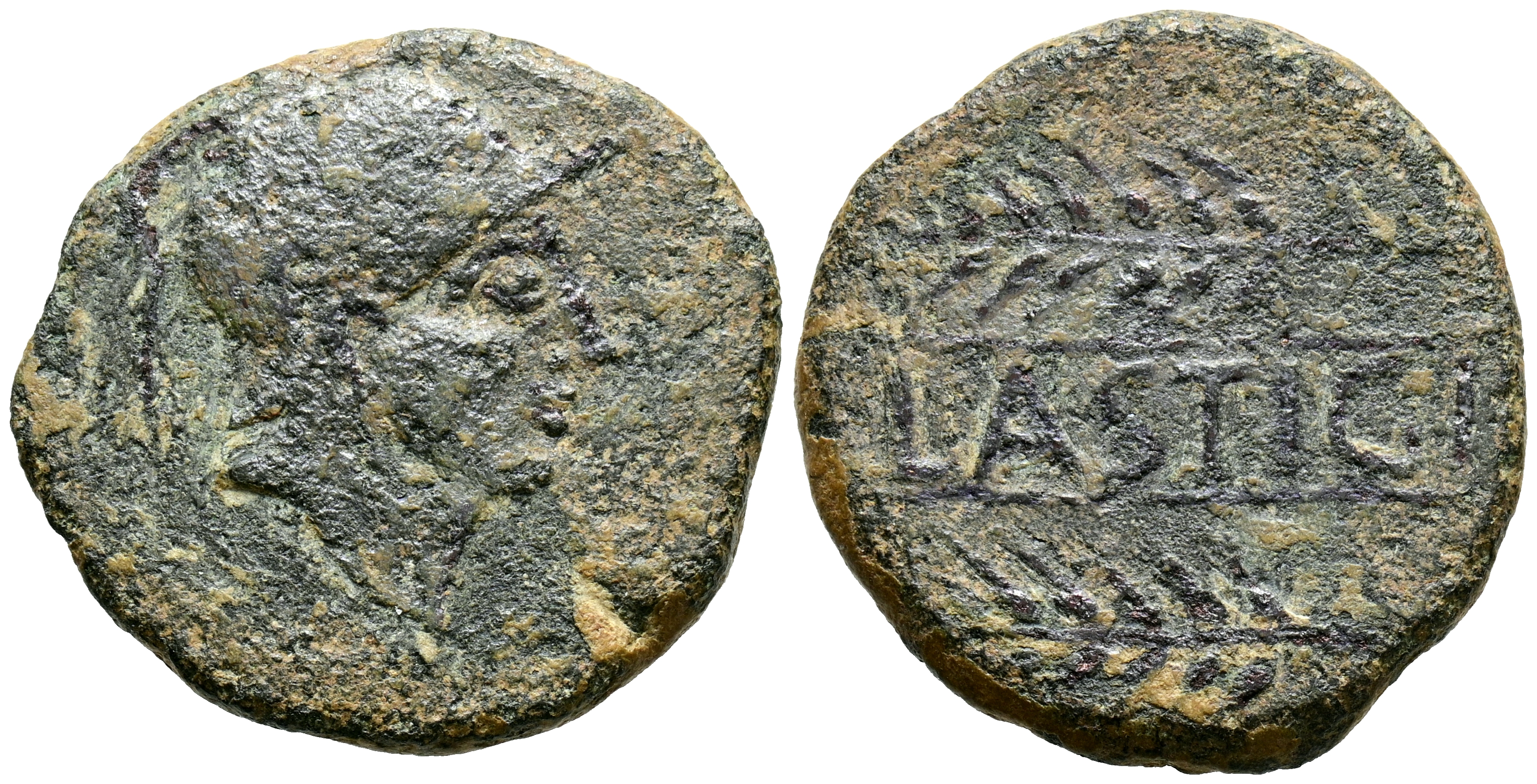 LASTIGI (cerca de Aznalcóllar, Sevilla). As. (Ae. 9,76g/26mm). 150-50 a.C. (FAB-1675). Anv: Cabeza masculina con casco a derecha, dentro de láurea. Rev: Leyenda: LASTIGI, entre dos espigas a izquierda. MBC-.