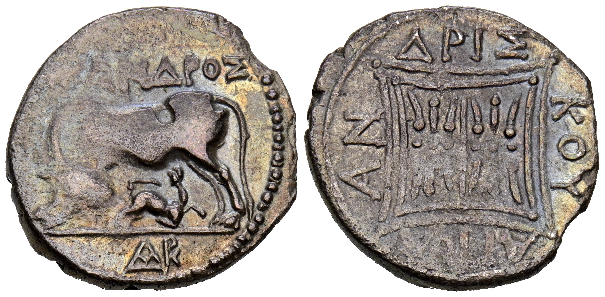 ILLYRIA, Apollonia. Dracma. (Ar. 2,55g/17mm). 80-48 a.C. Magistrados de Andriskos y Nikandros. (HGC 3, 4; Maier 13). Anv: Vaca estante a izquierda alimentando a ternero, en exergo monograma griego, encima leyenda griega: NIKANΔPOΣ. Rev: Doble diseño estrellado dentro de cuadrado, que representa el jardín de Alkinoos, alrededor leyenda griega: AΠOΛ / AN-ΔPIΣ-KOY. MBC. Ligero tono irisado.