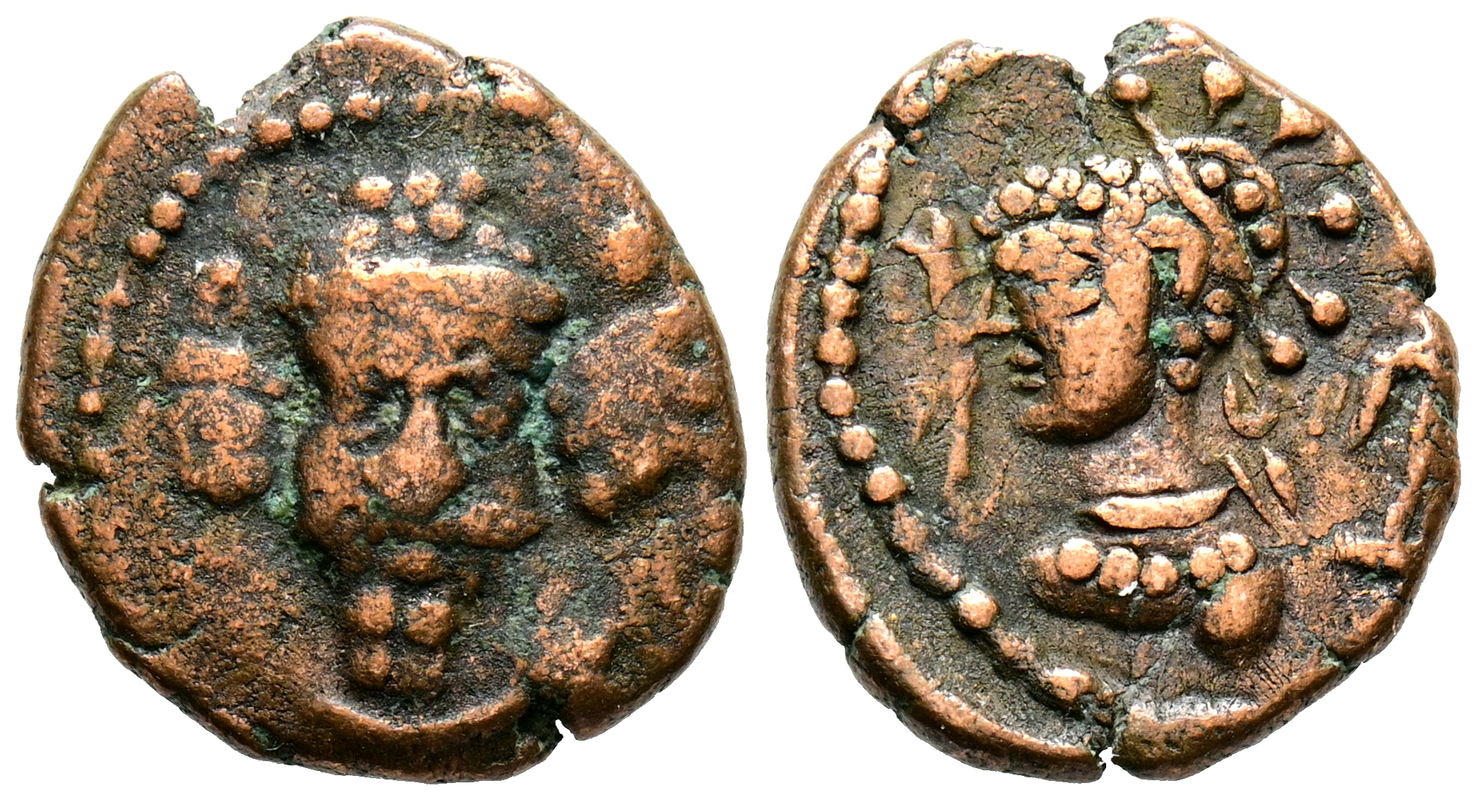 REYES DE ELYMAIS. Orodes IV. Dracma. (Ae. 2,75g/16mm). segunda mitad del siglo II d.C. (van't Haaff 17.2, Subtipo 1-1.b). Anv: Busto diadema y drapeado de Orodes IV de frente con dos grandes moños de cabello. Rev: Busto drapeado de Artemisa con tiara adornada con perlas hacia la izquierda, detrás un ancla. MBC. Limpiada.