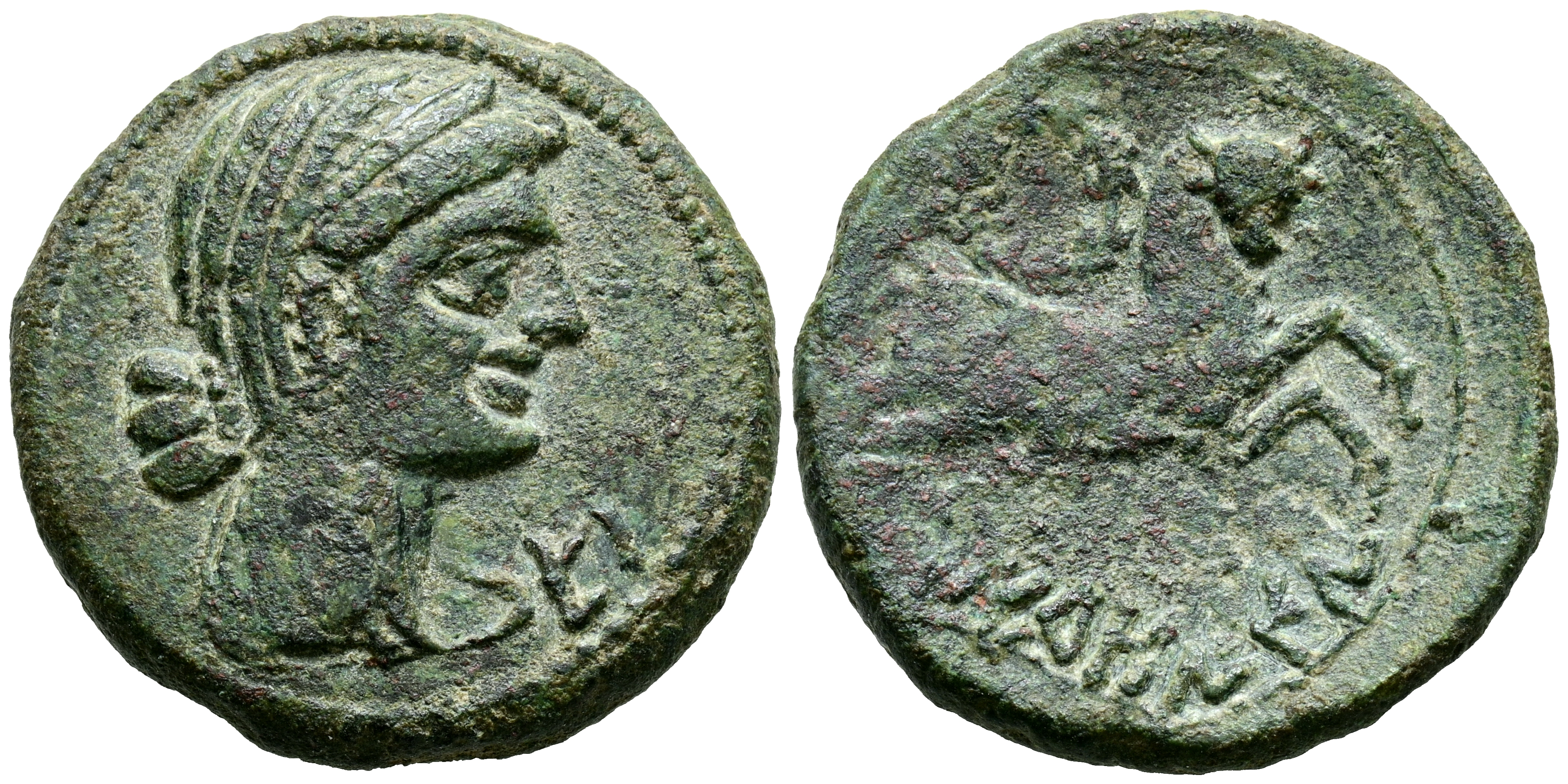 NERONKEN (Narbona, Francia). As. (Ae. 14,66g/27mm). Siglo I a.C. (ACIP 2693). Anv: Cabeza femenina velada, delante letra ibérica EI. Rev: Toro saltando a derecha, encima corona de laurel, debajo leyenda ascendento: NERONKEN. EBC-/MBC+. Precioso ejemplar, muy raro así.