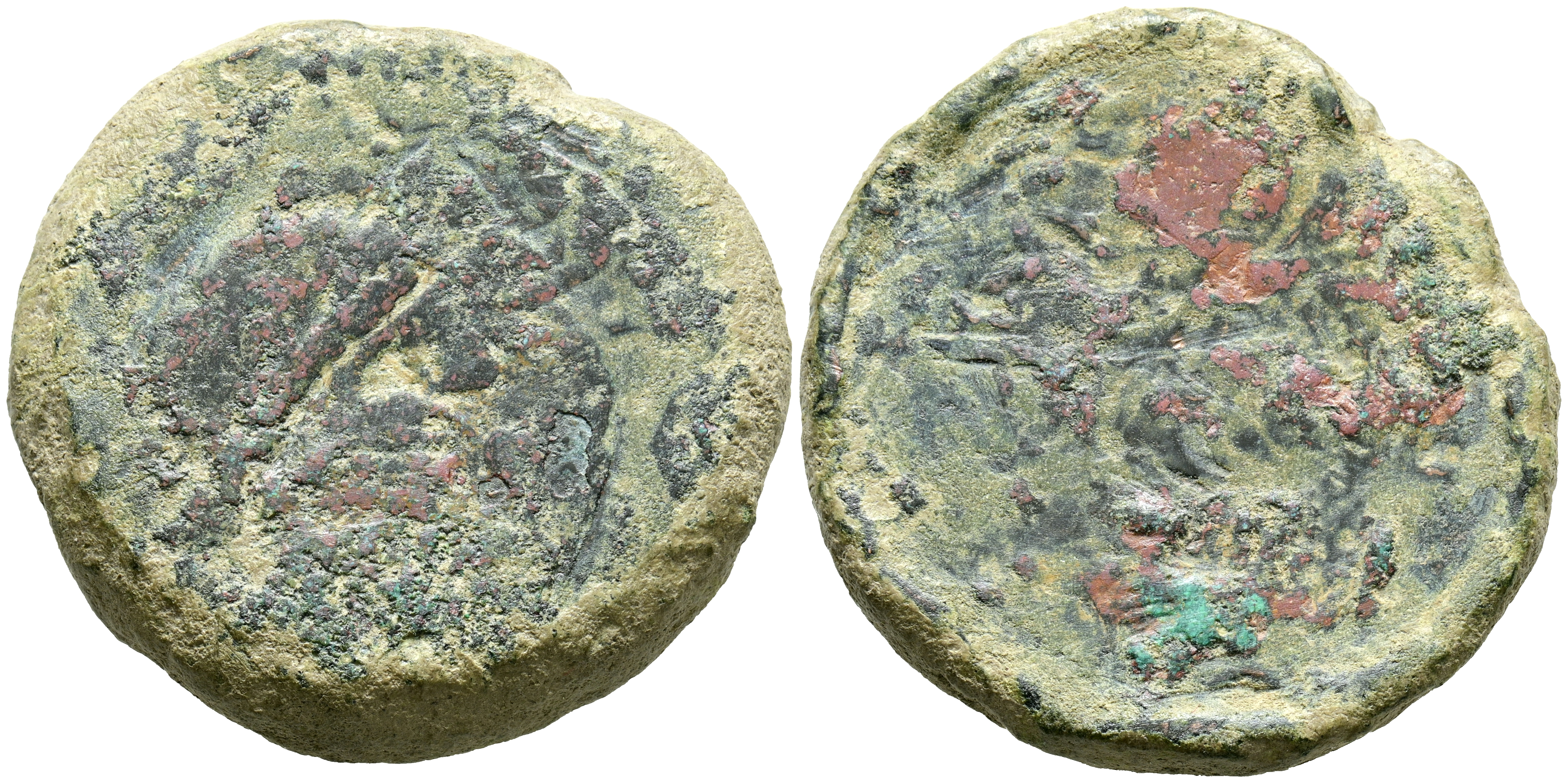 OBULCO (Porcuna, Jaén). Dupondio. (Ae. 43,99g/38mm). 220 20 a.C. (FAB-1778). Anv: Cabeza femenina a derecha, delante leyenda: OBVLCO y creciente. Rev: Arado a derecha con espiga y yugo, leyenda ibérica: IBuLCa. BC-. Muy escasa.