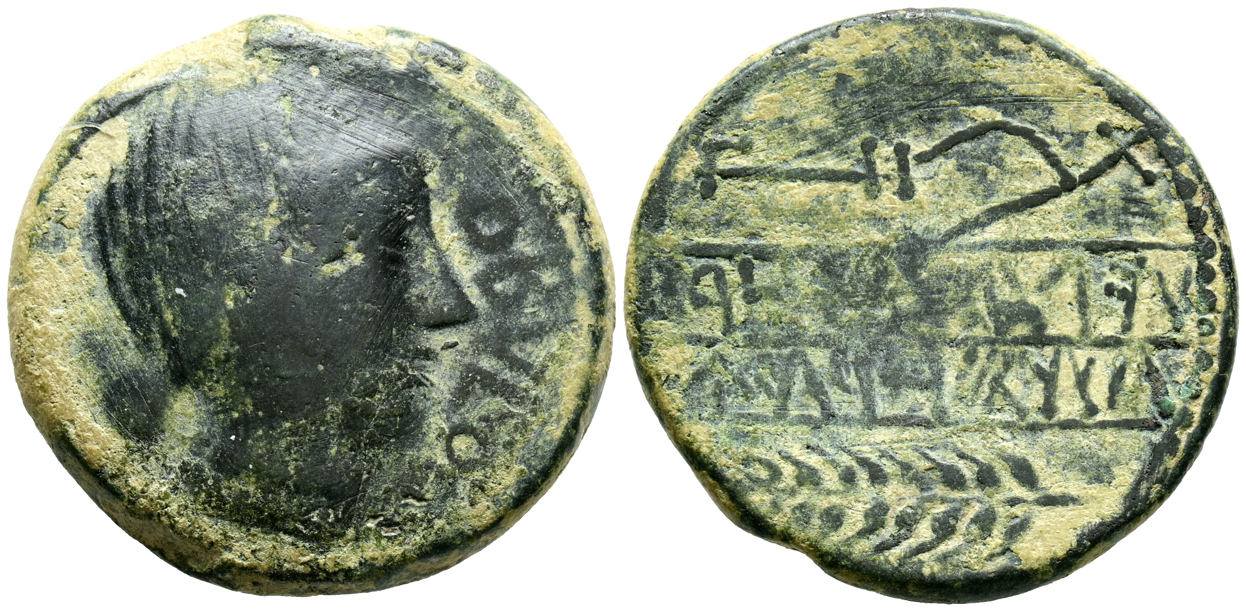 OBULCO (Porcuna, Jaén). As. (Ae. 16,44g/29mm). 220-20 a.C. (FAB-1781). Anv: Cabeza femenina a derecha, delante leyenda: OBVLCO. Rev: Arado a derecha, debajo espiga a izquierda, entre ellos leyenda: ILTeRTuOR / CaBeSORIU. MBC-/MBC.