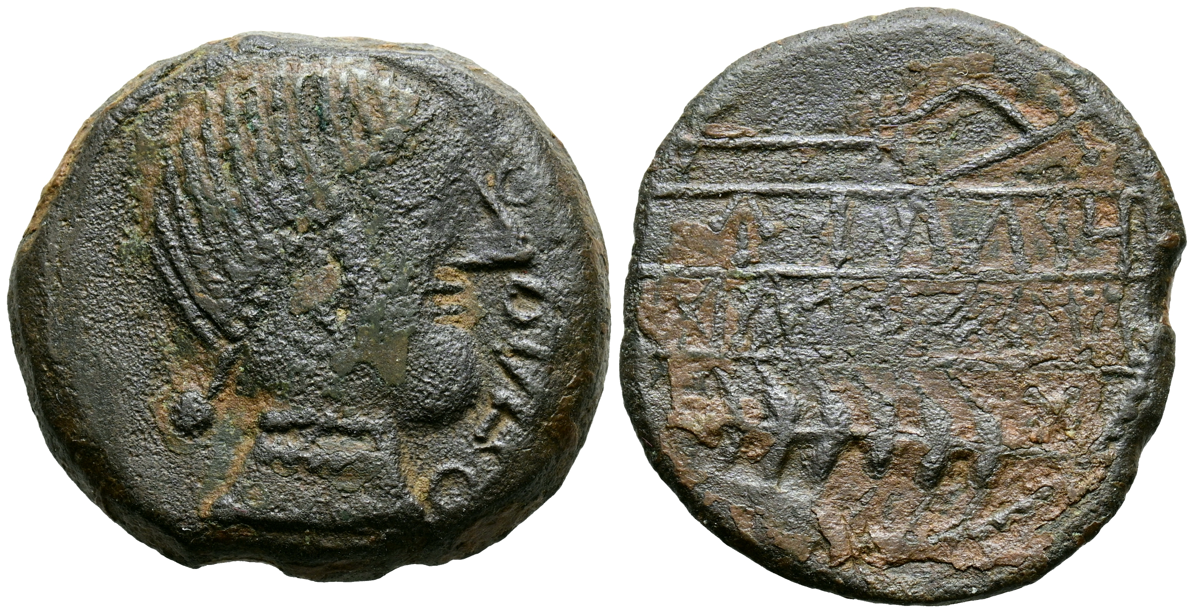 OBULCO (Porcuna, Jaén). As. (Ae. 15,35g/28mm). 220-20 a.C. (FAB-1791). Anv: Cabeza femenina a derecha, delante leyenda: OBVLCO. Rev: Arado a derecha, debajo espiga a izquierda, entre ellos leyenda: ORCaILV/NTuSTuLDuCo. MBC.