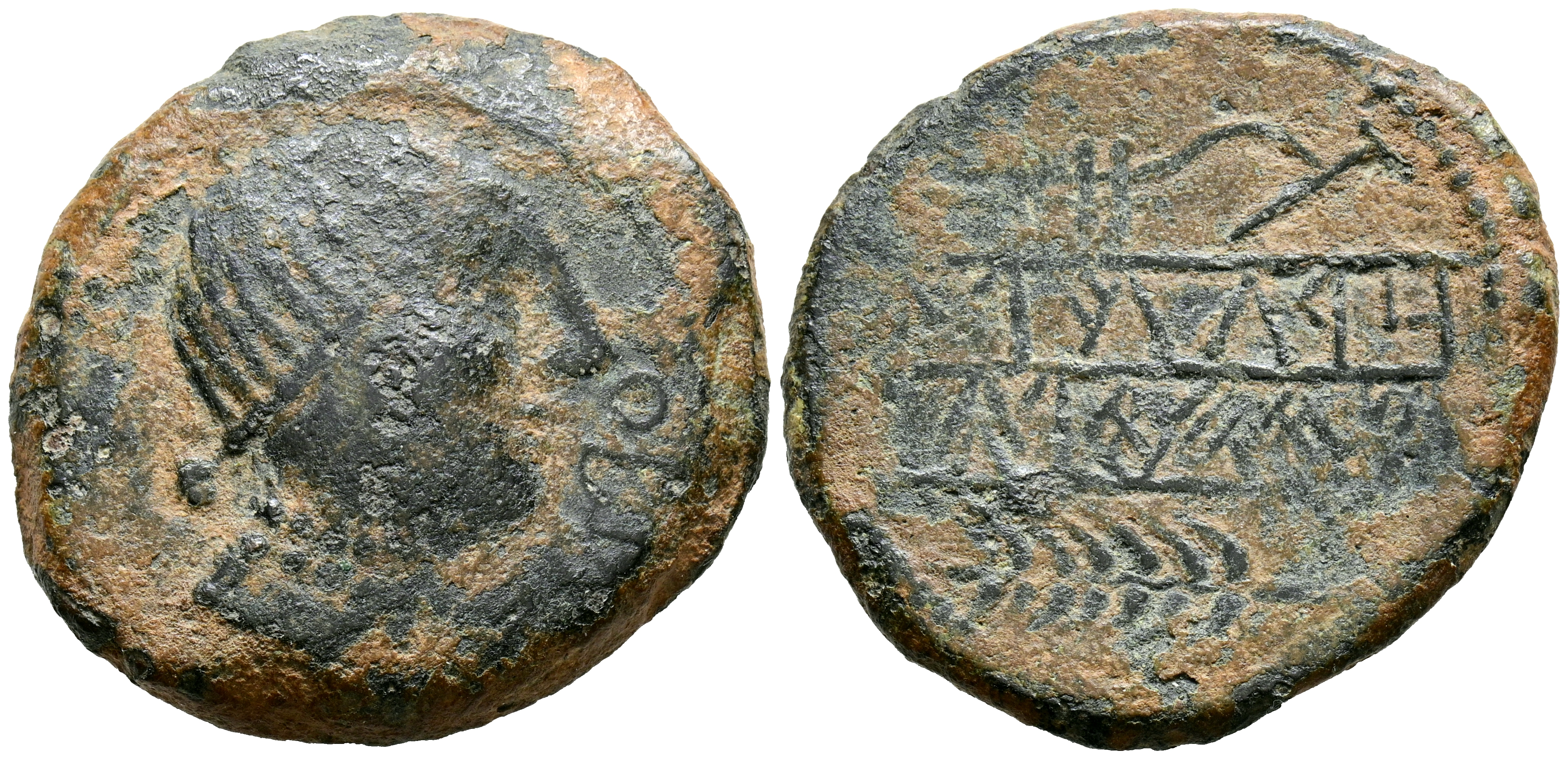 OBULCO (Porcuna, Jaén). As. (Ae. 19,14g/31mm). 220-20 a.C. (FAB-1791). Anv: Cabeza femenina a derecha, delante leyenda: OBVLCO. Rev: Espiga a derecha, debajo espiga a izquierda, entre ellos leyenda: ORCaILV/NTuSTuLDuCo, letra: Ta encima de espiga. MBC-.