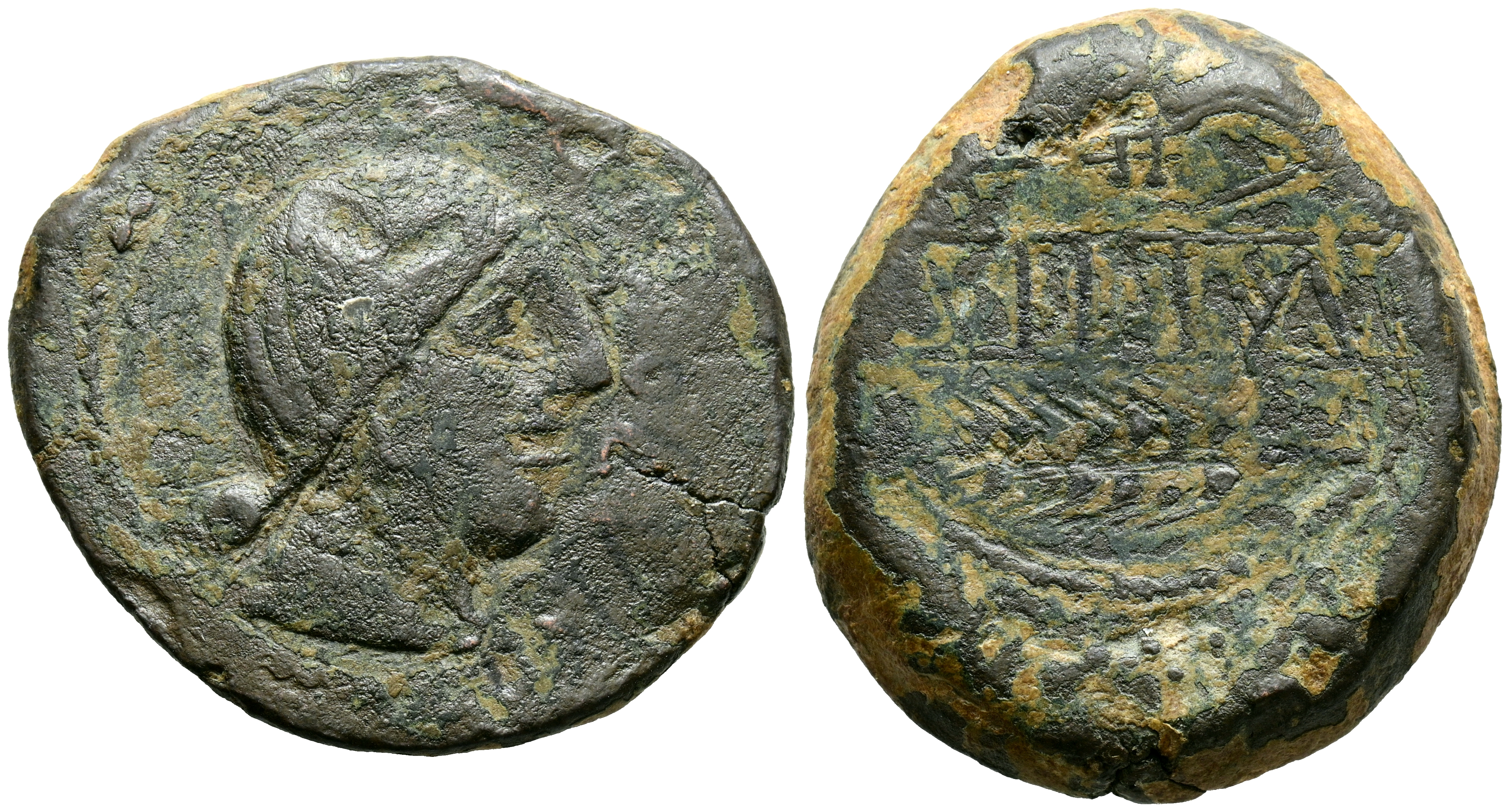 OBULCO (Porcuna, Jaén). As. (Ae. 26,63g/33mm). 220-20 a.C. (FAB-1806). Anv: Cabeza femenina a derecha, delante leyenda: OBVLCO, detrás letra ibércia: TA. Rev: Leyenda ibérica: IBuLCa, entre arado a derecha y espiga a izquierda, encima letra: TA. MBC-.