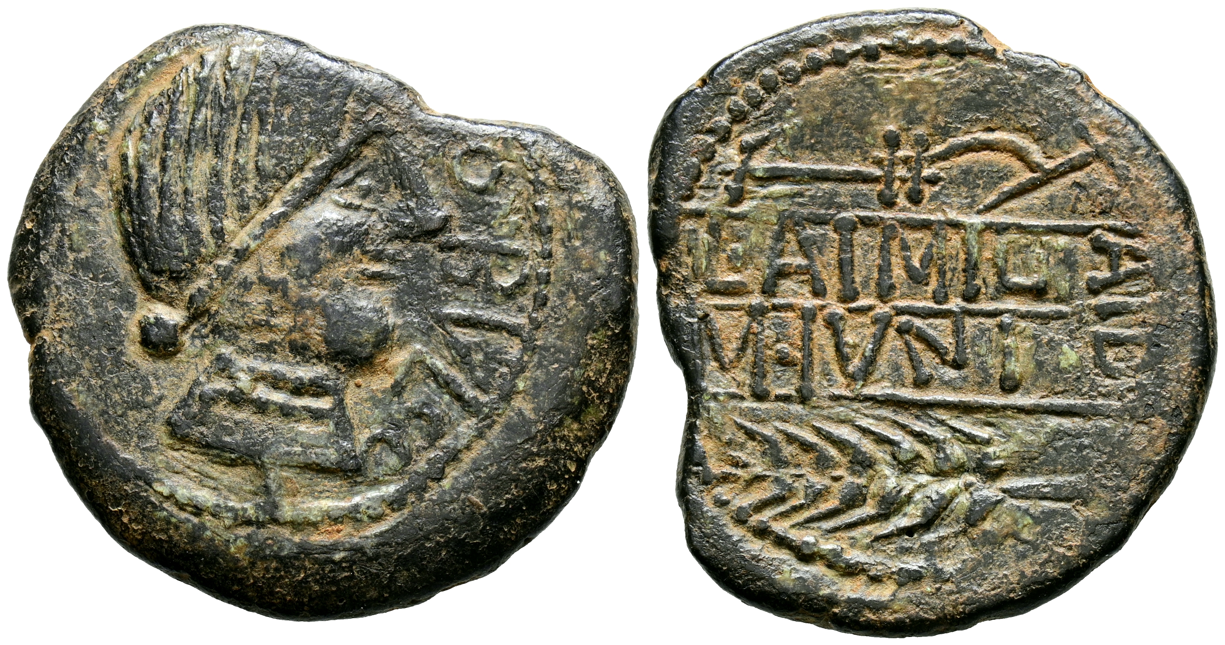 OBULCO (Porcuna, Jaén). As. (Ae. 10,66g/30mm). 220-20 a.C. (FAB-1815). Anv: Cabeza femenina a derecha, delante leyenda externa: OBVLCO, detrás creciente y letra ibérica Ta. Rev: Arado a derecha, debajo espiga a izquierda, entre ellos leyenda: L AIMIL/ M IVNI/ AID. MBC-. Cospel faltado.