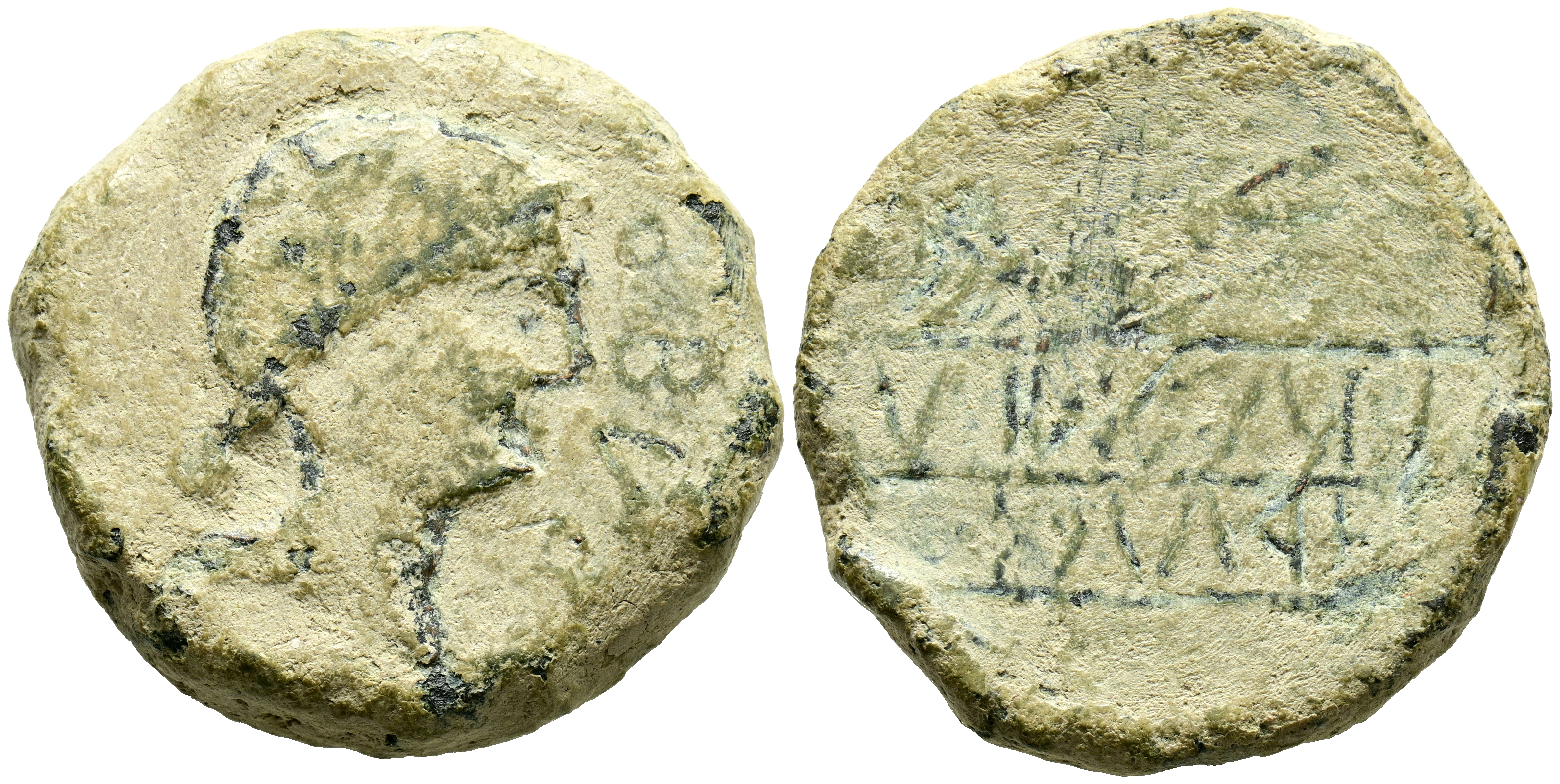 OBULCO (Porcuna, Jaén). Plomo monetiforme. (Pb. 31,46g/34mm). 220-20 a.C. (FAB-1779). Anv: Cabeza femenina diademada a la derecha, delante: OBVLCO. Rev: Arado a la derecha y espiga a la izquierda, debajo leyenda ibérica: SIUBoLAI/ORCaIL. MBC/MBC-. Muy escasa.