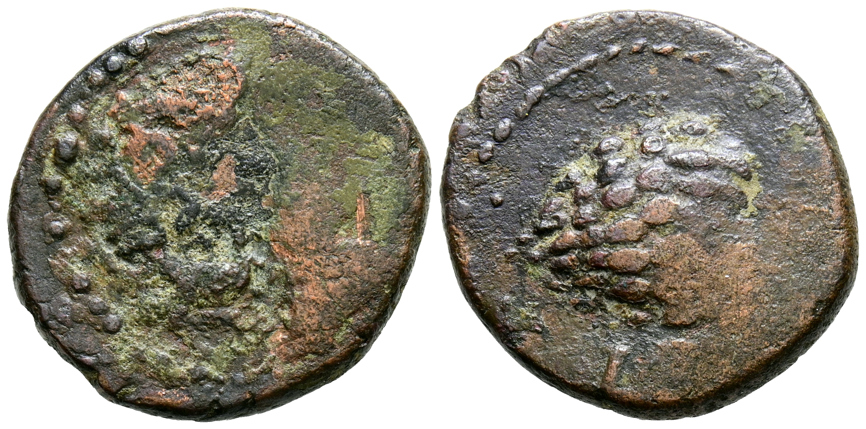 OLONT (Aznalcázar, Sevilla). Semis. (Ae. 5,23g/20mm). 50-20 a.C. (FAB-1882). Anv: Cabeza masculina a la derecha. Rev: Piña a la izquierda, leyenda debajo: OLVNT. BC-/BC.