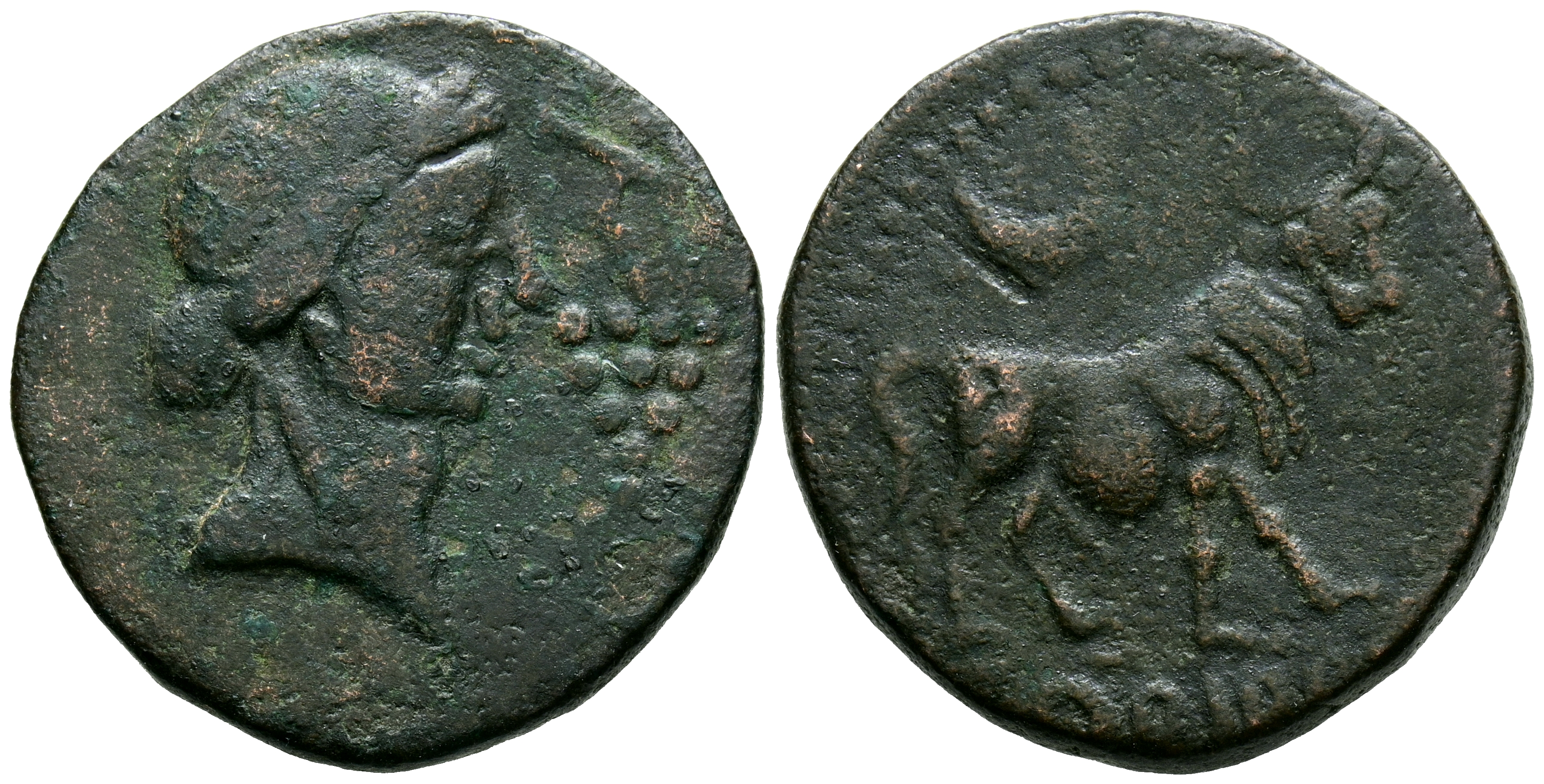ORIPPO (Dos Hermanas, Sevilla). As. (Ae. 9,89g/25mm). 50 a. C. (FAB-1903). Anv: Cabeza femenina a derecha, delante racimo de uvas. Rev: Toro a la derecha, encima creciente, debajo de la línea leyenda: ORIPPO. MBC. Repatinada.