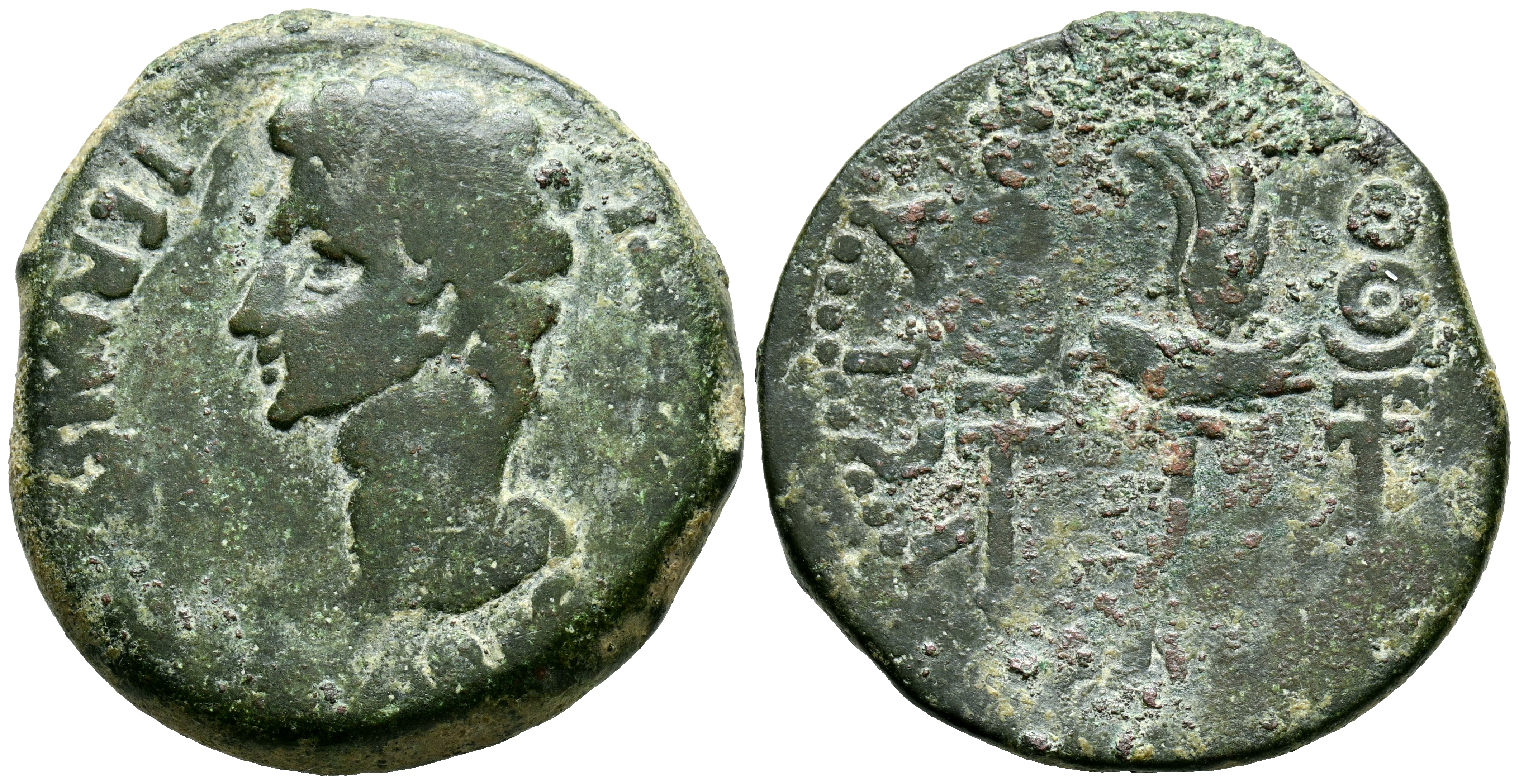 COLONIA PATRICIA (Córdoba). Dupondio. (Ae. 14,41g/31mm). 27 a.C.-14 d.C. (FAB-1988). Anv: Cabeza de Augusto a izquierda, alrededor leyenda: PERMISSV CAESARIS AVGVSTI. Rev: Enseñas y águila legionaria a izquierda, alrededor leyenda: COLONIA PATRICIA. MBC-. Escaso ejemplar.