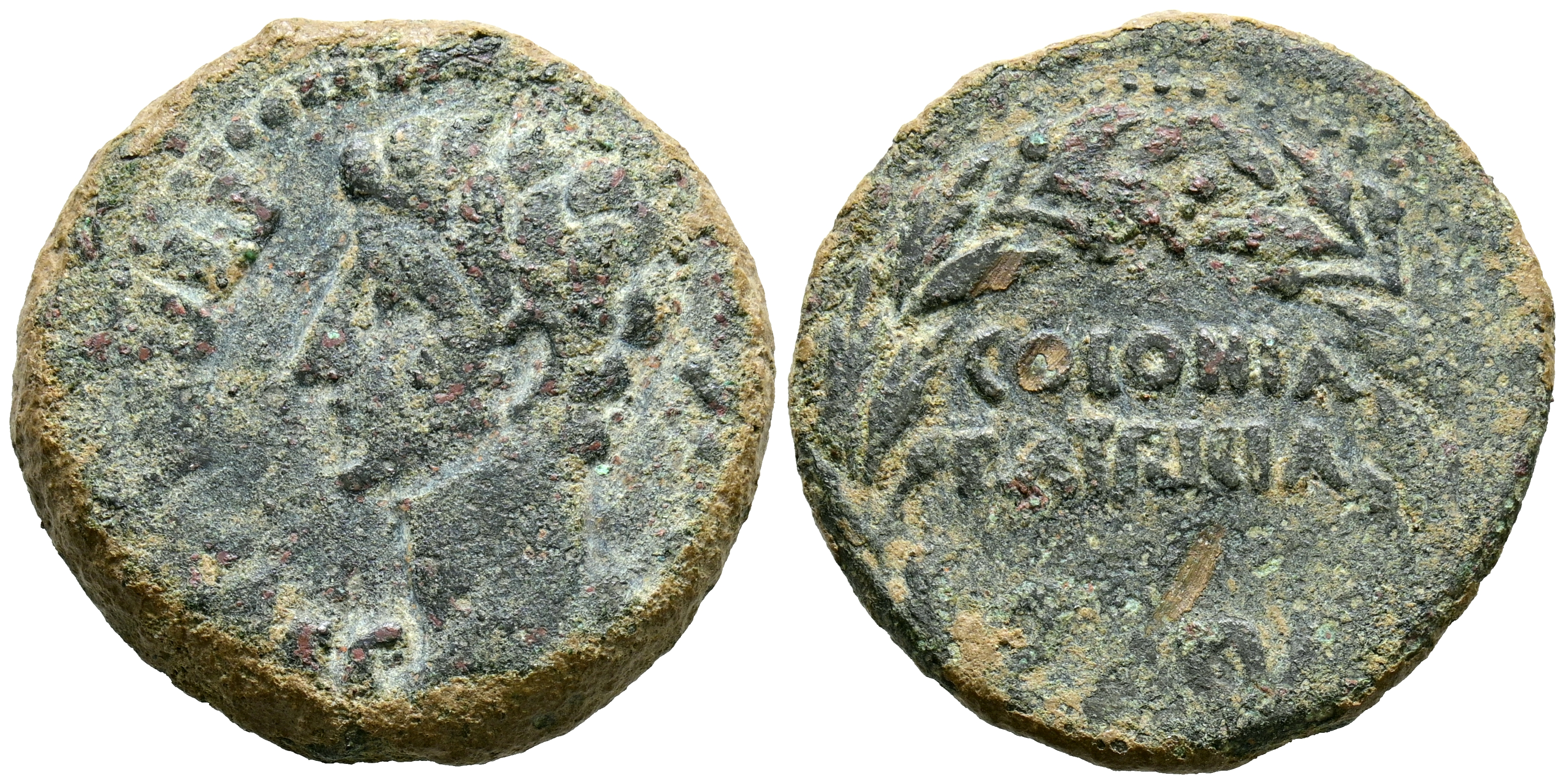 COLONIA PATRICIA (Córdoba). As. (Ae. 10,58g/26mm). 27 a.C.-14 d.C. (FAB-1989). Anv: Cabeza de Augusto a izquierda, alrededor leyenda: PERM CAES AVG. Rev: Leyenda: COLONIA PATRICIA, dentro de corona de laurel. MBC