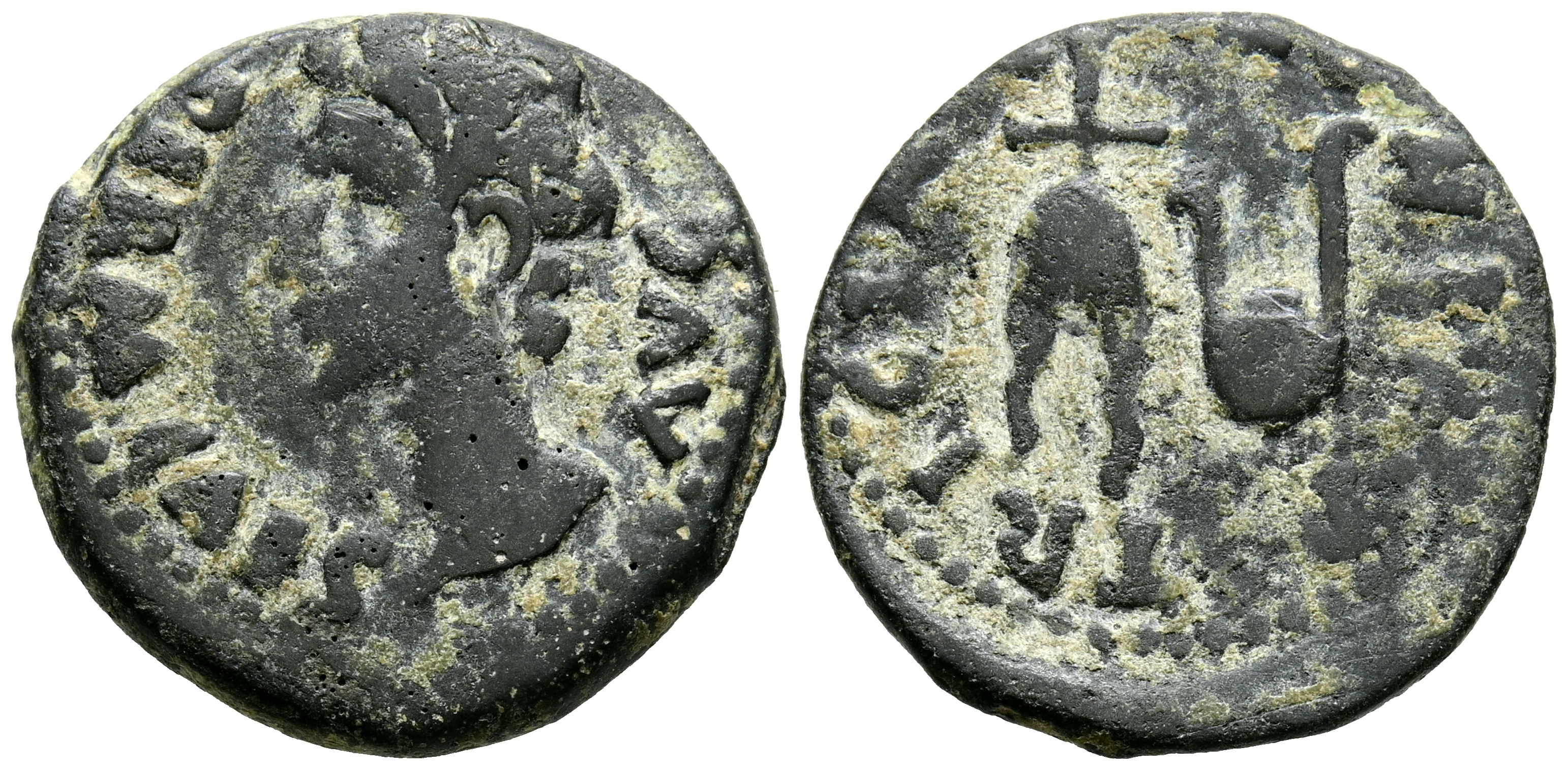 COLONIA PATRICIA (Córdoba). Semis. (Ae. 4,62g/21mm). 27 a.C.-14 d.C. (FAB-1992). Anv: Cabeza de Augusto a la izquierda, alrededor leyenda: PERM CAES AVG. Rev: Gorro flamígero y símpulo, alrededor de la leyenda: COLONIA PATRICIA. BC+.