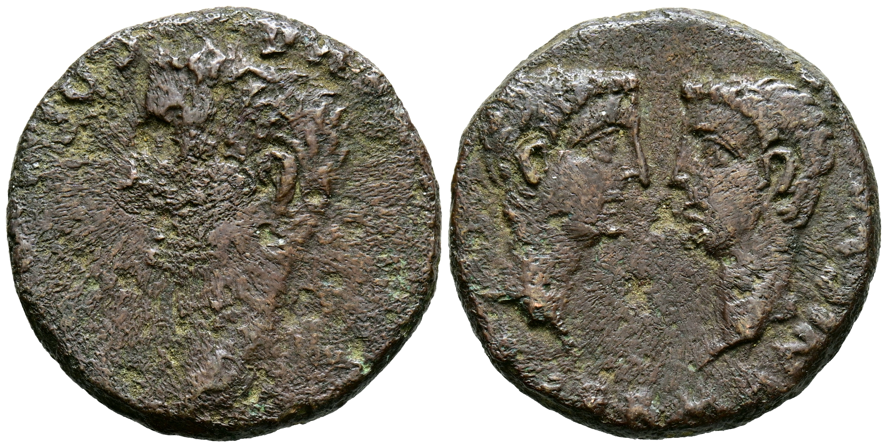 COLONIA ROMULA (Sevilla). As. (Ae. 9,14g/24mm). 27 a.C.-14 d.C. (FAB-2016). Anv: Cabeza laureada de Tiberio a izquierda, alrededor leyenda: PERM DIVI AVG COL ROM. Rev: Cabezas de Germánico y Druso enfrentadas, alrededor leyenda: CAESAR GERMANICVS CAESAR DRVSVS. MBC-.