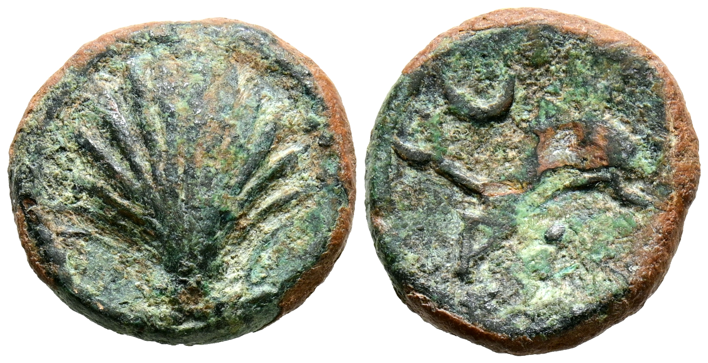 ARSE-SAGUNTO (Sagunto, Valencia). Cuadrante. (Ae. 3,19g/16mm). 170-20 a.C. (FAB-2052). Anv: Concha. Rev: Delfín a derecha, encima creciente, debajo letra ibérica A y estrella. MBC.