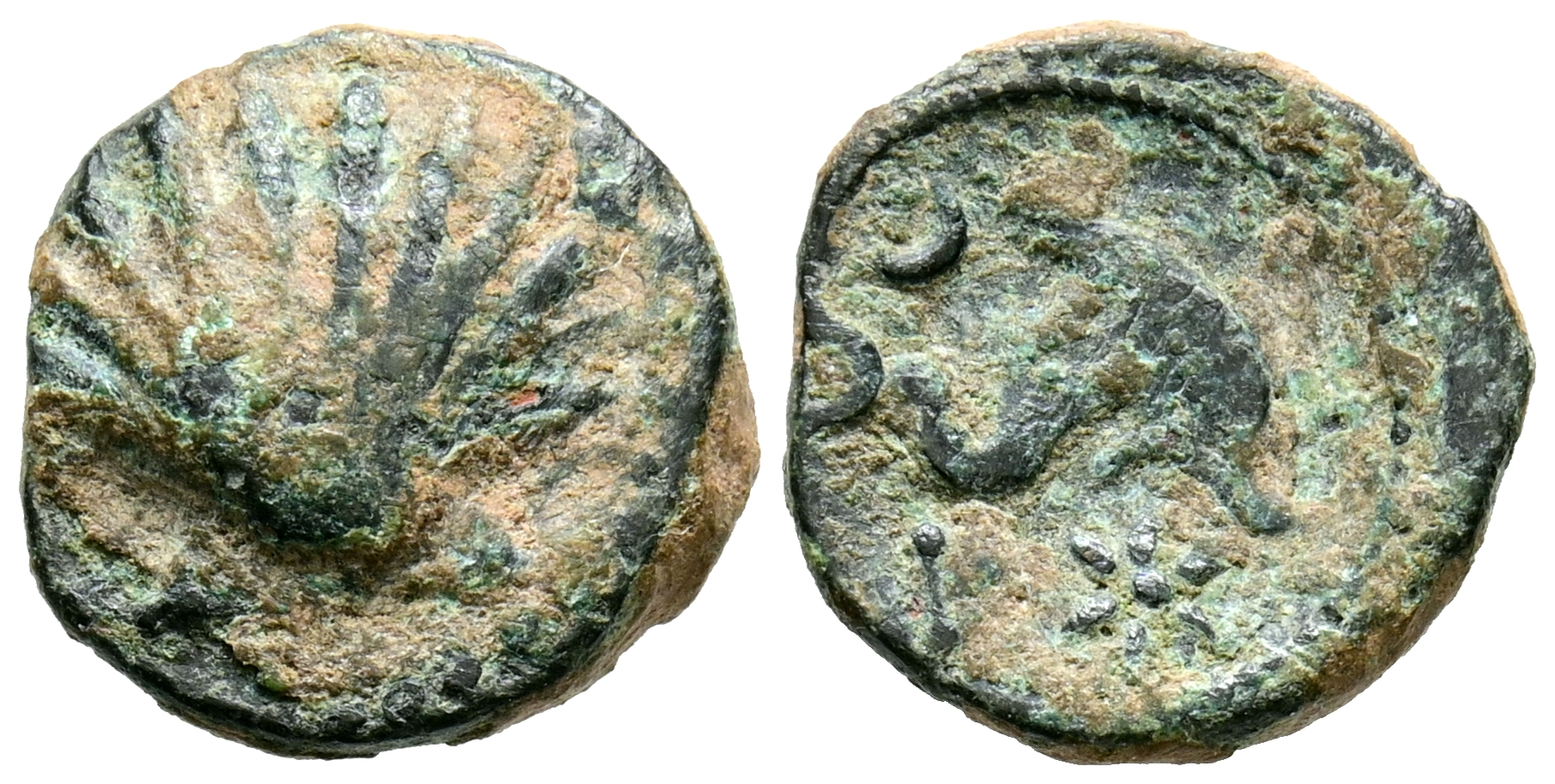 ARSE-SAGUNTO (Sagunto, Valencia). Sextante. (Ae. 1,49g/12mm). 170-20 a.C. (FAB-2064). Anv: Delfín, encima letra ibérica: A y creciente, debajo letras Ibéricas A, I y estrella. MBC-.