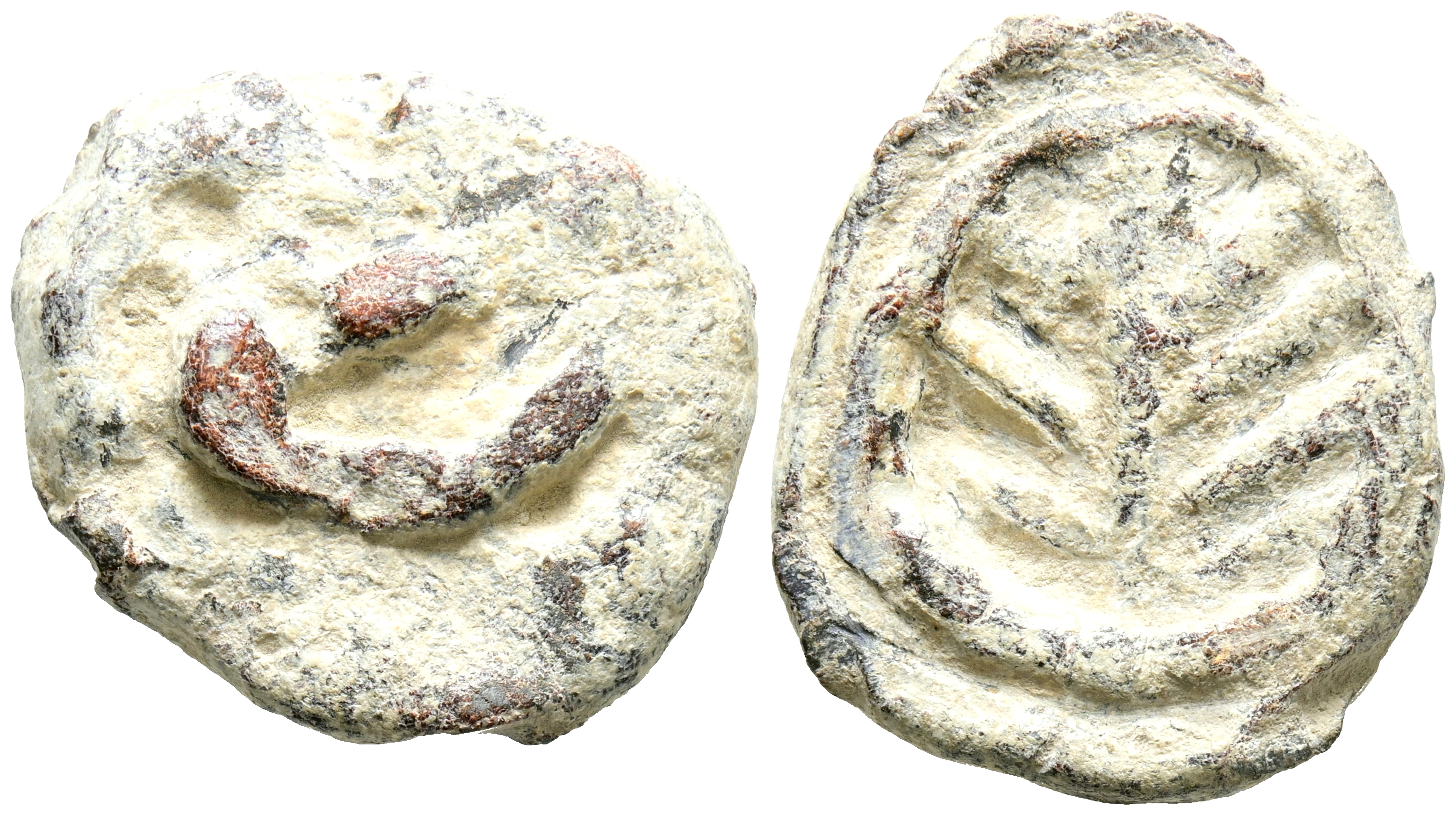SEARO (Utrera, Sevilla). Plomo monetiforme. (Pb. 11,10g/23mm). 120-50 a. C. (CCP- pag15. Anv: Cabeza femenina a la derecha. Rev: Palma o espiga. MBC.