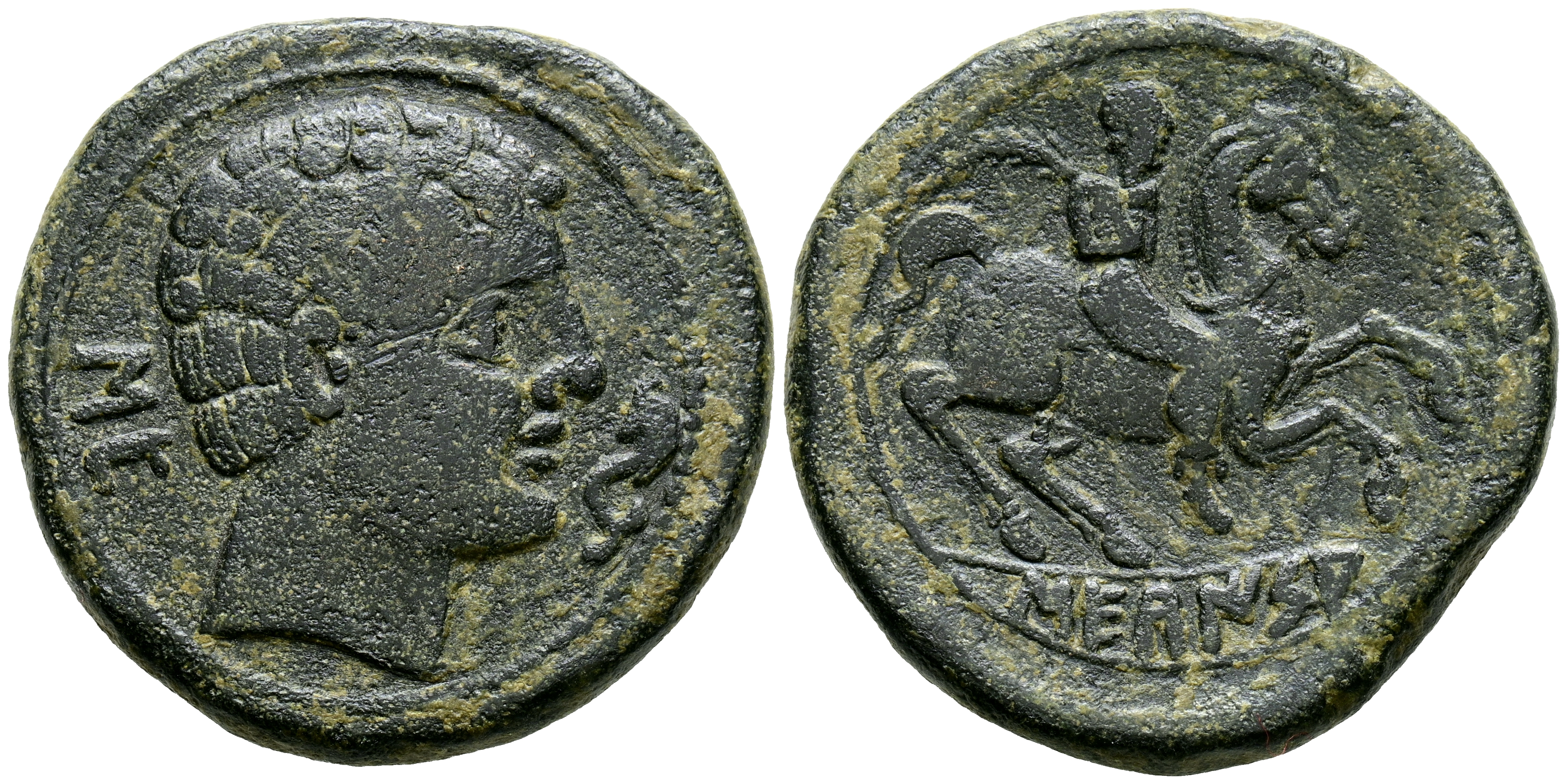 SECAISA (Segeda, Zaragoza). As. (Ae. 19,92g/31mm). 120-20 a.C. (FAB-2121). Anv: Cabeza masculina a derecha, detrás letras ibéricas: SE, delante delfín. Rev: Jintete con palma a derecha, debajo leyenda ibérica: SECaISA. MBC.