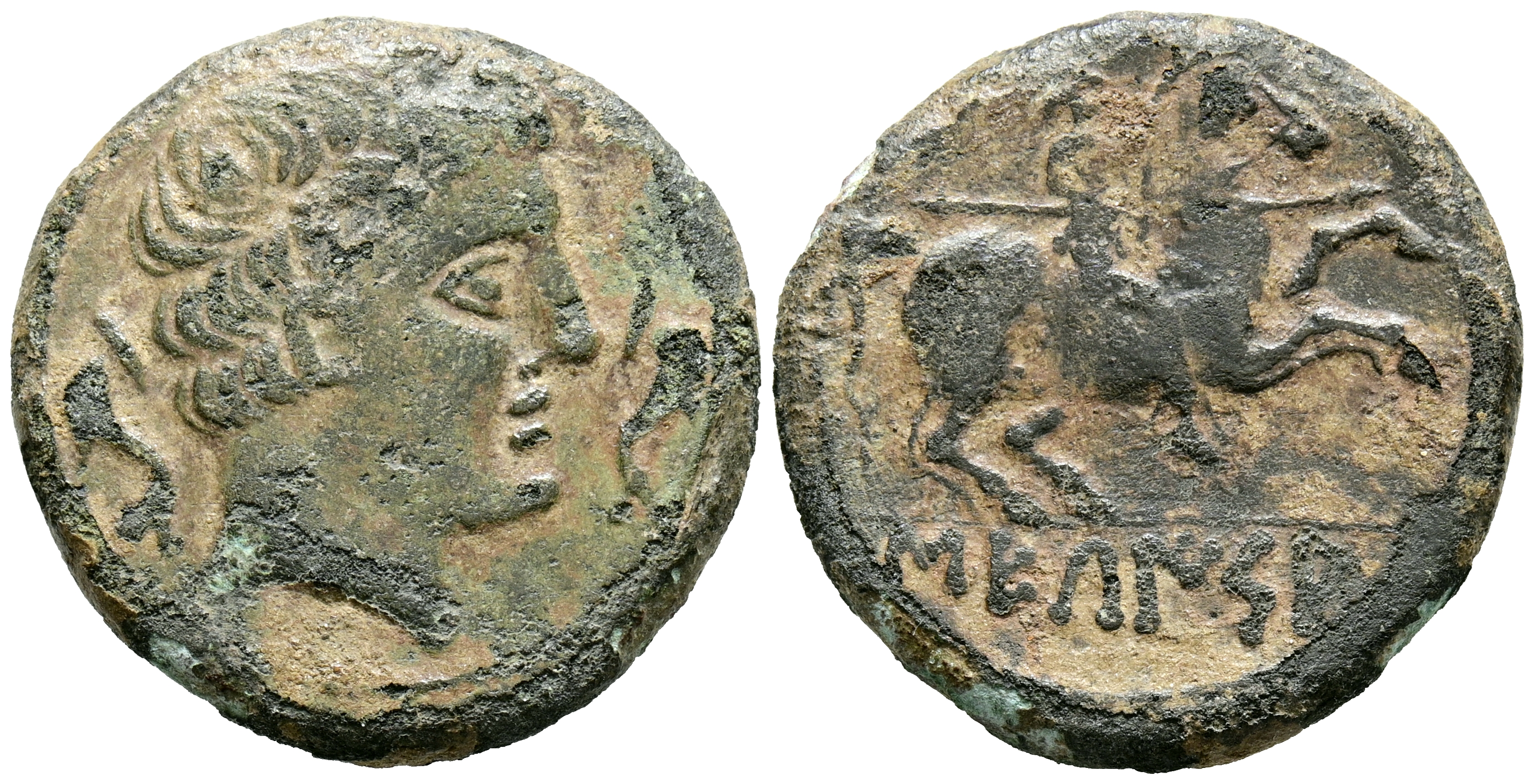 SECAISA (Segeda, Zaragoza). As. (Ae. 7,82g/23mm). 120-20 a.C. (FAB-2131). Anv: Cabeza masculina a derecha entre delfines. Rev: Jinete con lanza a derecha, debajo leyenda bajo línea: SECaISA. MBC.