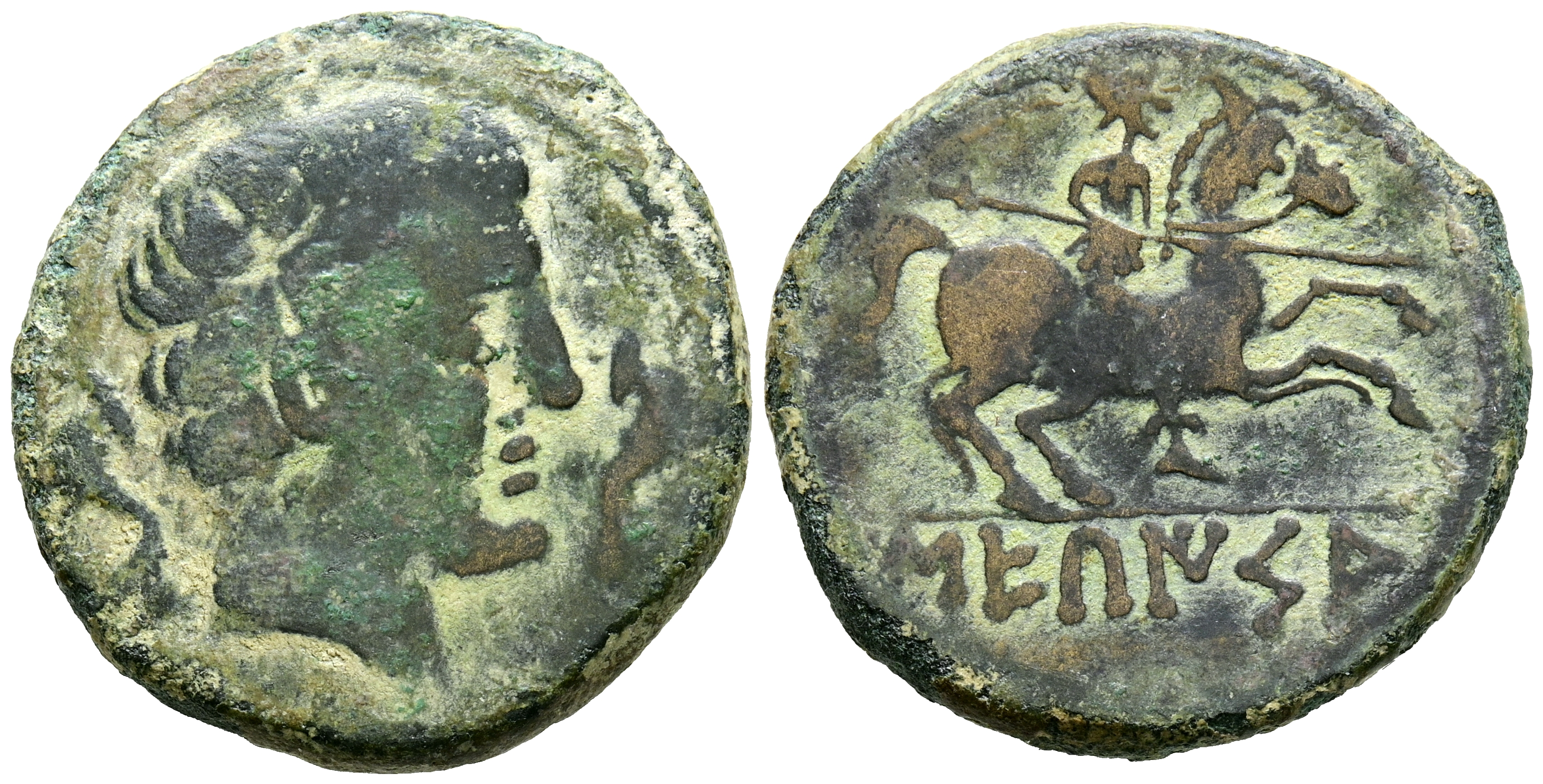 SECAISA (Segeda, Zaragoza). As. (Ae. 9,38g/24mm). 120-20 a.C. (FAB-2131). Anv: Cabeza masculina a derecha, entre dos delfines. Rev: Jinete con lanza a derecha, debajo leyenda ibérica: SECaISA. MBC-.