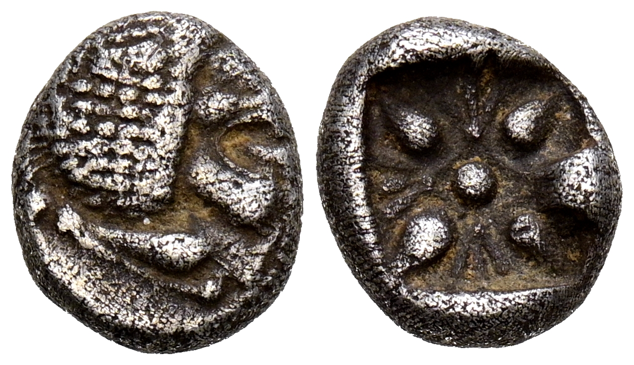 JONIA, Miletos. Dióbolo. (Ar. 1,17g/10mm). 600-500 a.C. (SNG Von Aulock 2080). Anv: Cabeza de leon a derecha. Rev: Diseño estrellado incuso. MBC.