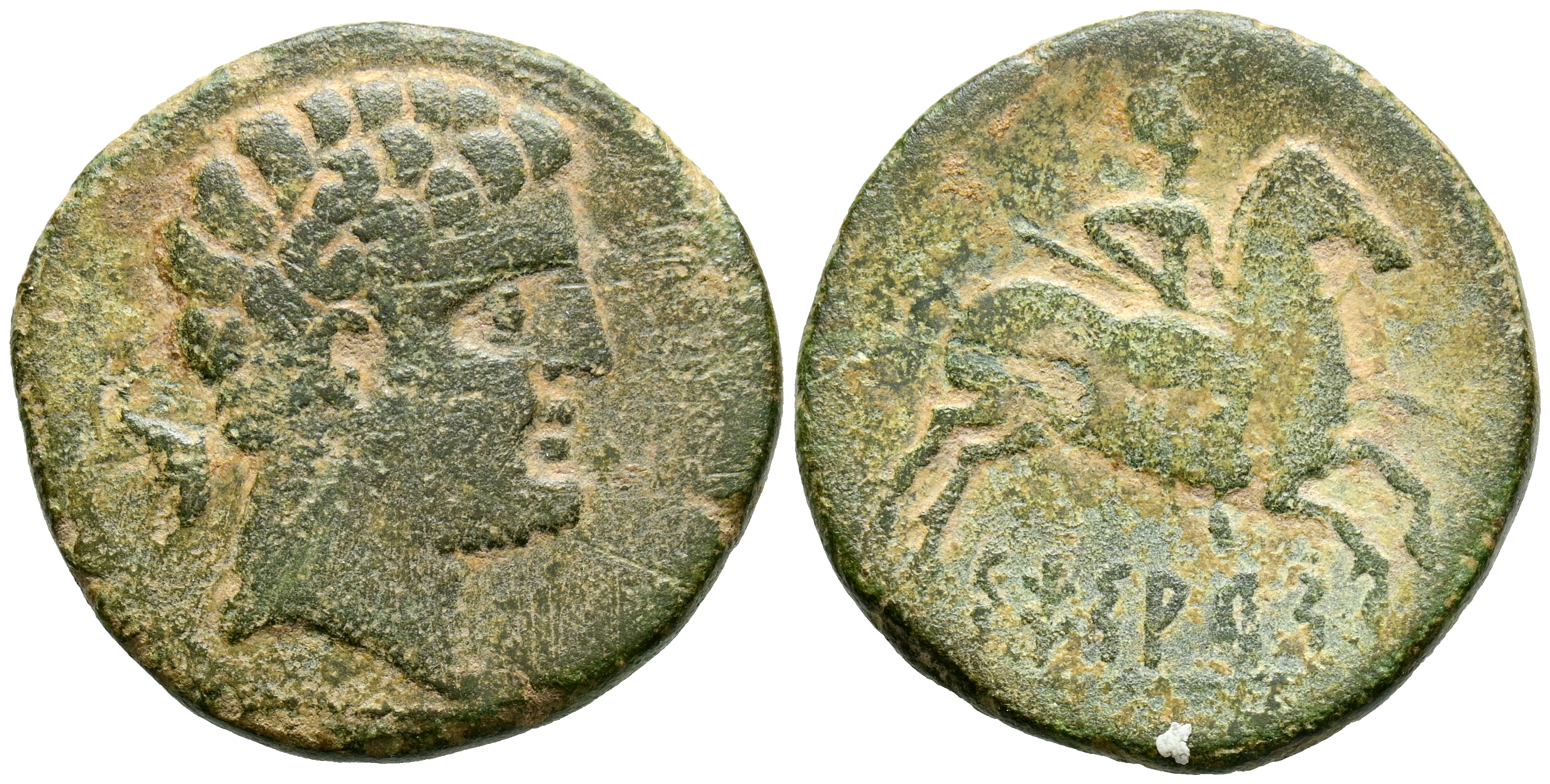SESARS (Zona de Aragón). As. (Ae. 9,88g/27mm). 120-20 a.C. (FAB-2198). Anv: Cabeza masculina barbada a derecha, detrás delfín. Rev: Jinete con lanza a derecha, encima estrella, debajo leyenda ibérica: SESARS. MBC-.