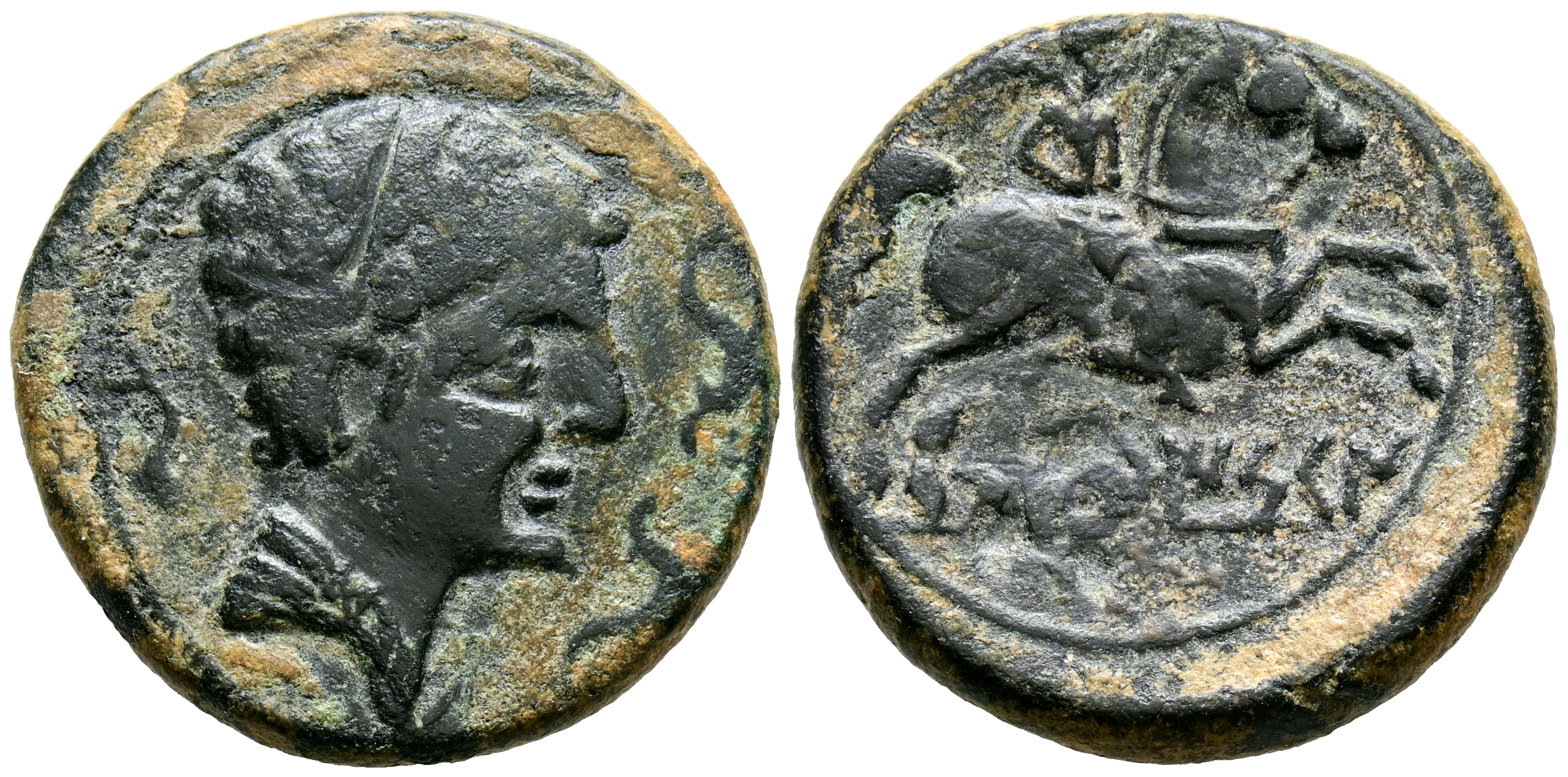 SETEISCEN (Sástago, Zaragoza). As. (Ae. 10,50g/26mm). 120-20 a.C. (FAB-2206). Anv: Cabeza masculina a derecha con adornos en el cuello, alrededor tres delfines. Rev: Jinete con palma a derecha, debajo leyenda ibérica: SETeISCeN. MBC-. Escaso ejemplar.