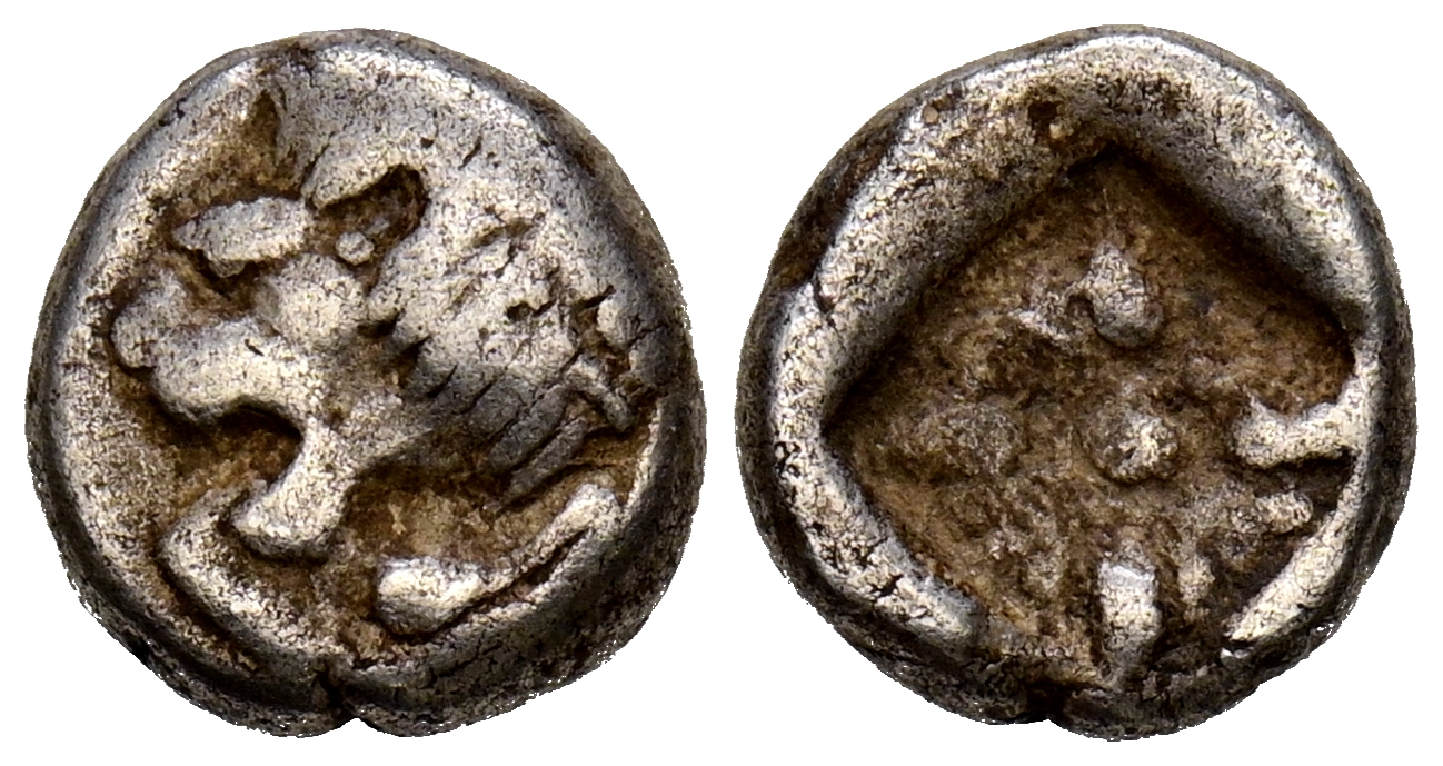 JONIA, Miletos. Dióbolo. (Ar. 1,12g/9mm). 600-500 a.C. (SNG Kayhan 476-81). Anv: Cabeza de león a izquierda. Rev: Diseño estrellado incuso. MBC.