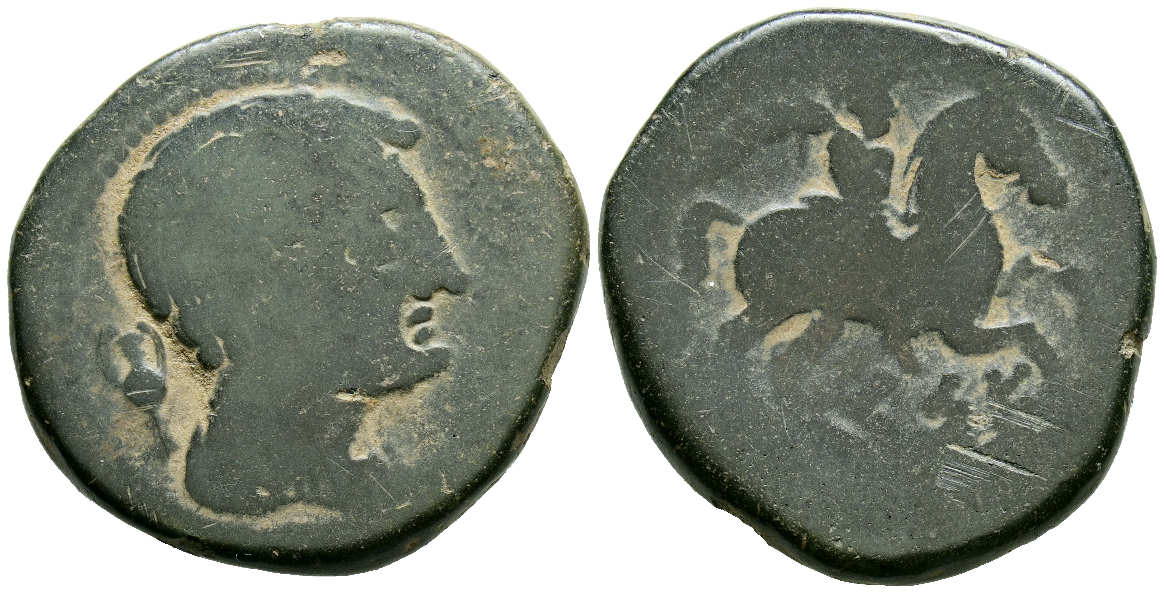 CESE (Tarragona). As. (Ae. 13,34g/27mm). 120-20 a.C. (FAB-2275). Anv: Cabeza masculina a derecha, detrás ánfora. Rev: jinete con palma a derecha, debajo leyenda ibérica: CeSE. BC+.