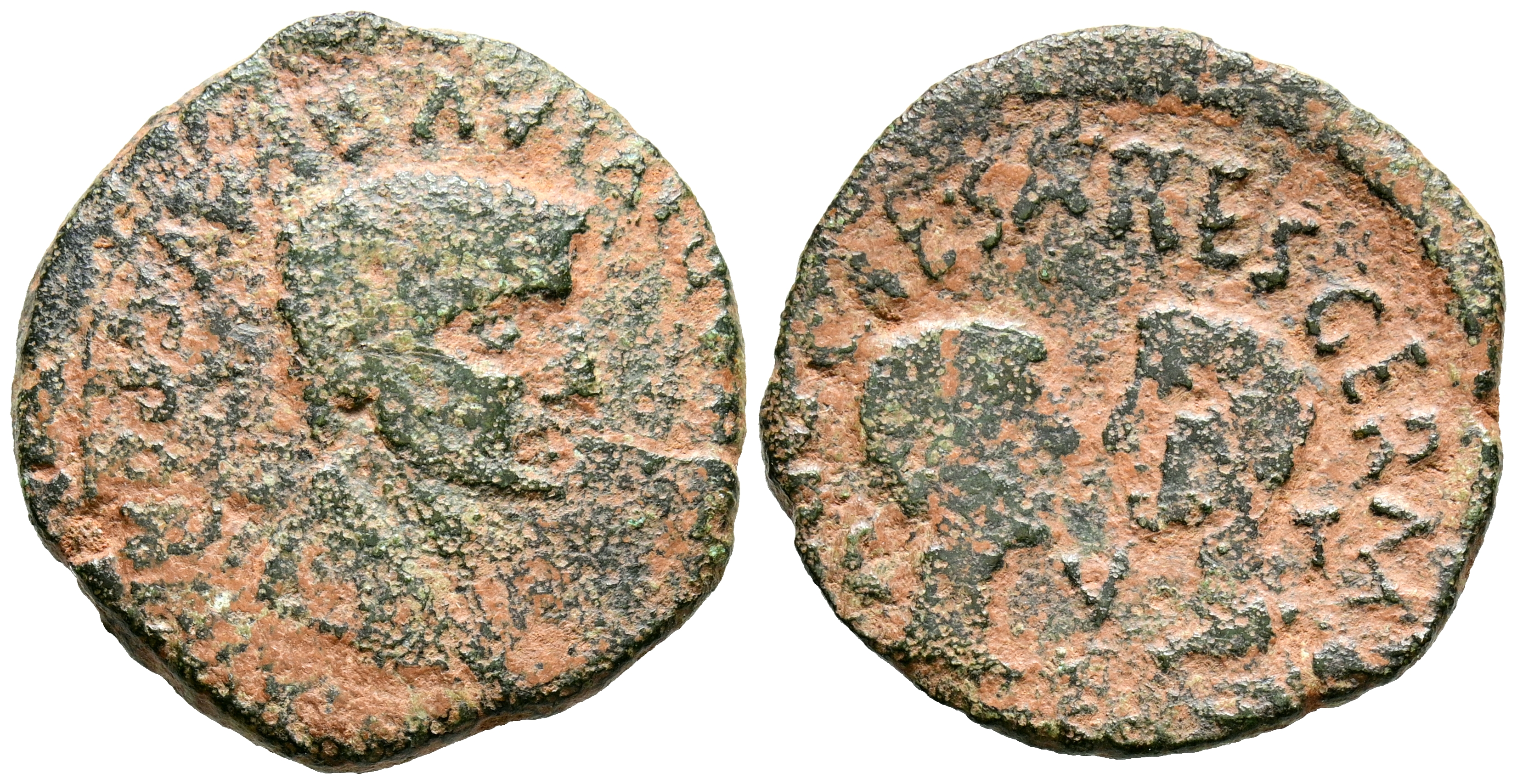 TARRACO (Tarragona). As. (Ae. 5,23g/24mm). 14-36 d.C. (FAB-2375). Anv: Cabeza de Tiberio a derecha, alrededor leyenda: TI CAESAR DIVI AVG F PONT MAX. Rev: Cabezas de Germánico y Druso enfrentadas, entre ellas: C-V-T, alrededor leyenda: CAESARES GERMANICVS DRVSVS. BC+. Limpiado.