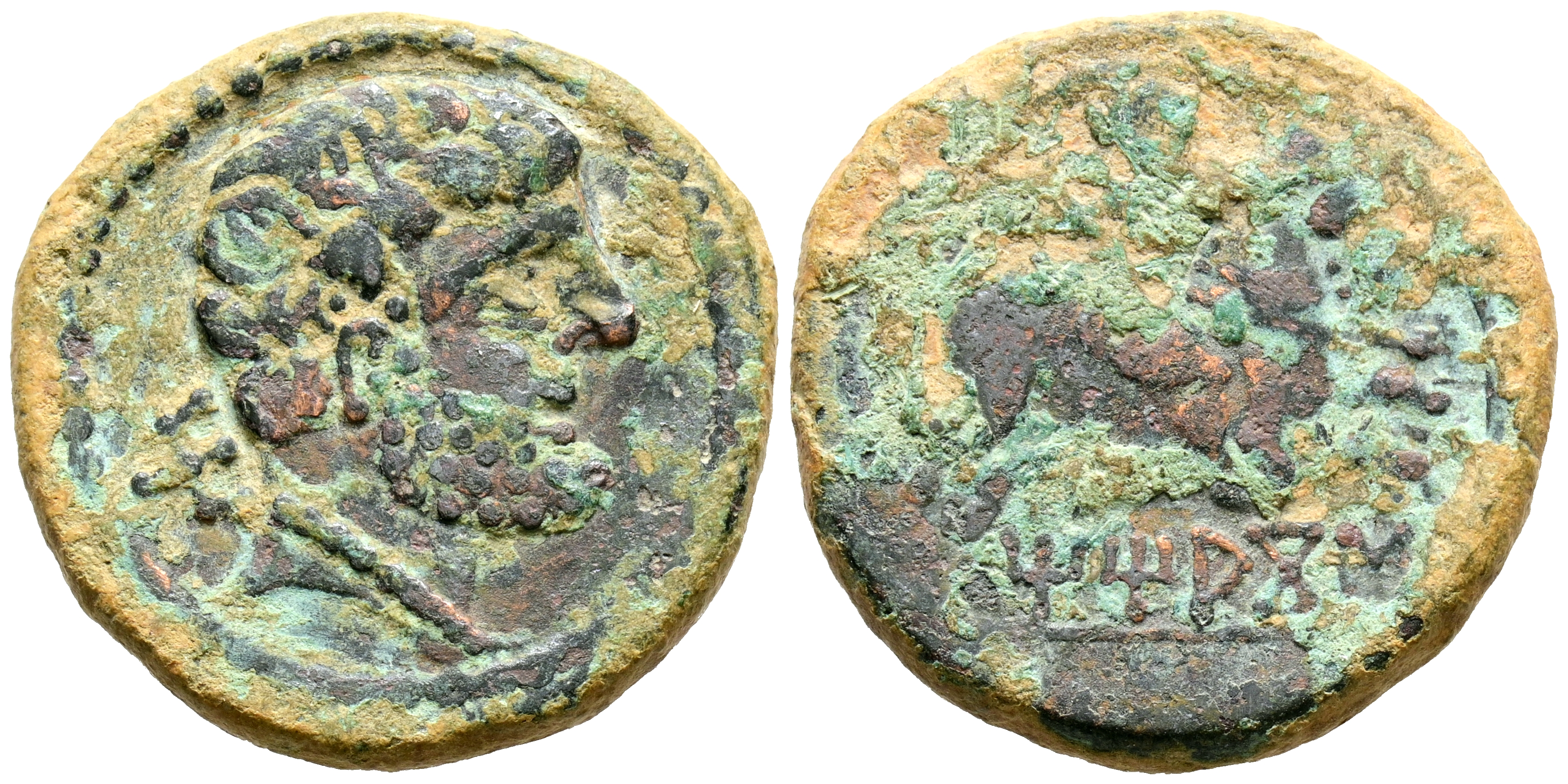 TITIACOS (Tricio, La Rioja). As. (Ae. 9,87g/25mm). 120-20 a.C. (FAB-2392). Anv: Cabeza masculina barbada a derecha, detrás letrá: Ti. Rev: Jinete con lanza a derecha, debajo leyenda ibérica: TiTiACoS. BC+. Concreciones en reverso.
