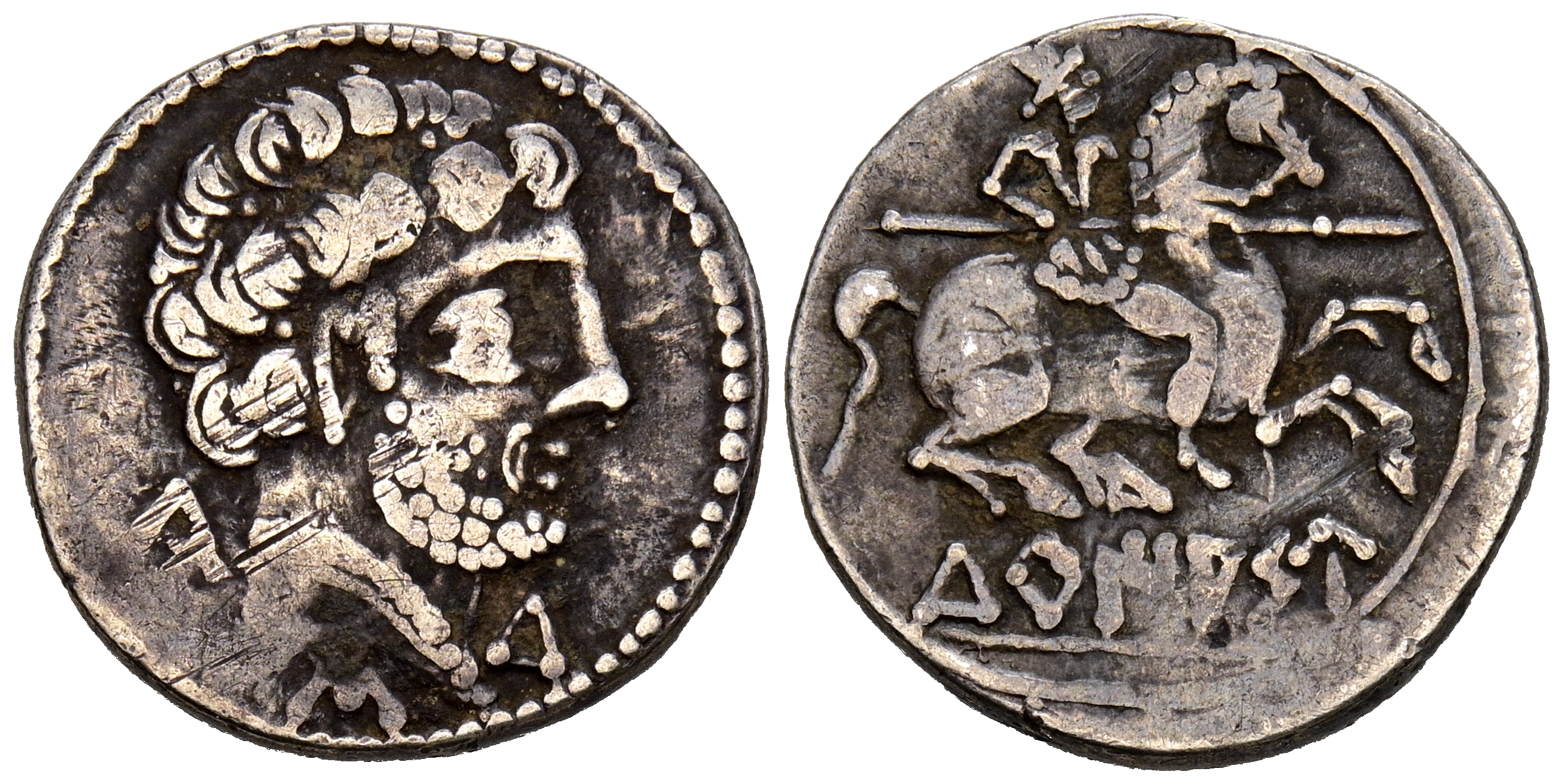 TURIASO (Tarazona, Zaragoza). Denario. (Ar. 3,54g/18mm). 120-20 a.C. (FAB-2412). Anv: Cabeza masculina barbada a derecha, detrás letra: CA, debajo: S y delante: Du. Rev: Jinete con lanza a derecha, debajo leyenda ibérica sobre línea: TuRIASU. MBC.