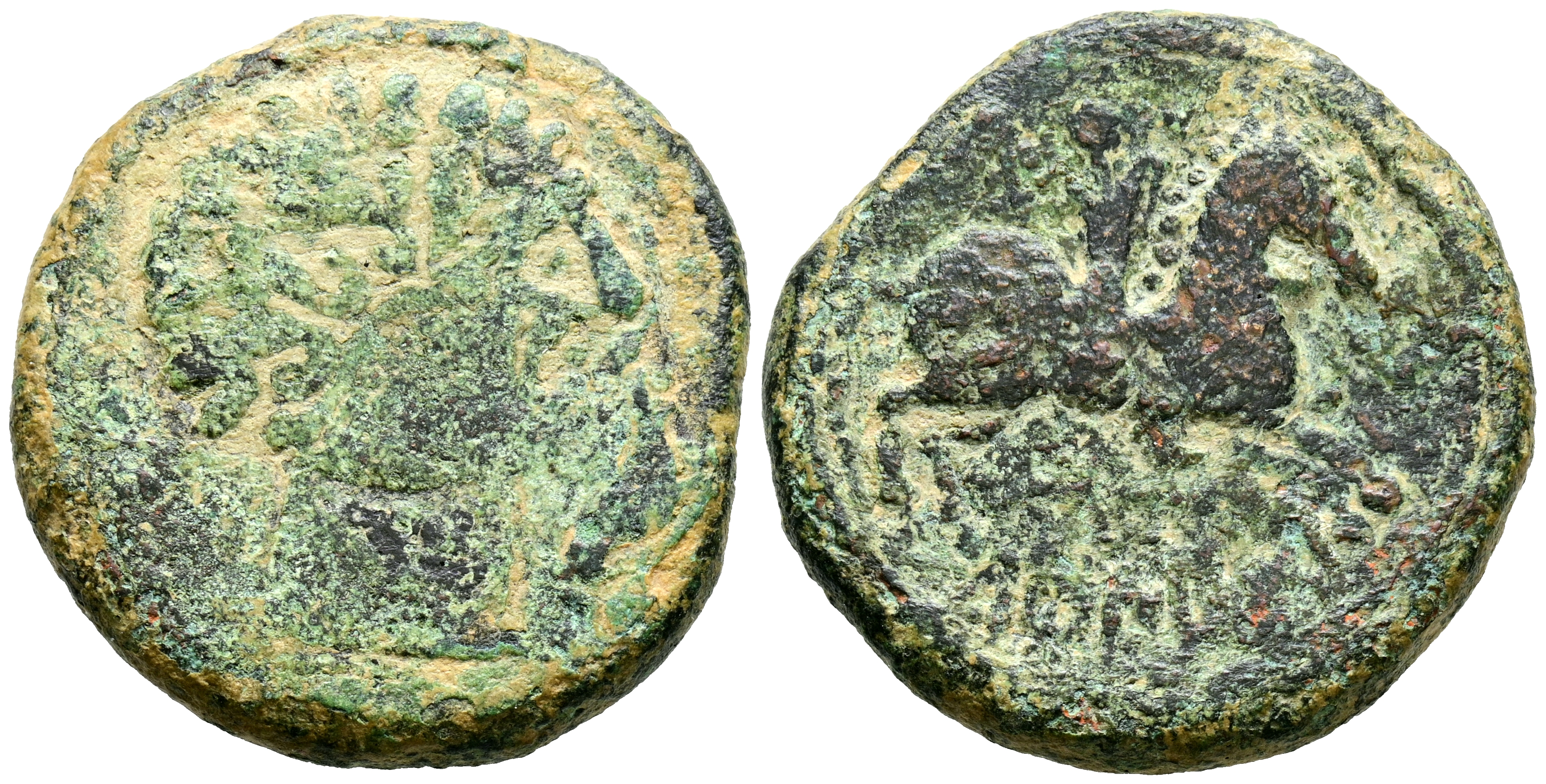 TURIASO (Tarazona, Zaragoza). As. (Ae. 12,43g/26mm). 120-20 a.C. (FAB-2428 var). Anv: Cabeza masculina barbada a derecha, alrededor tres delfines. Rev: Jinete con lanza a derecha, debajo leyenda ibérica curva: TuRIASU. BC. Raro ejemplar con este arte vascón.