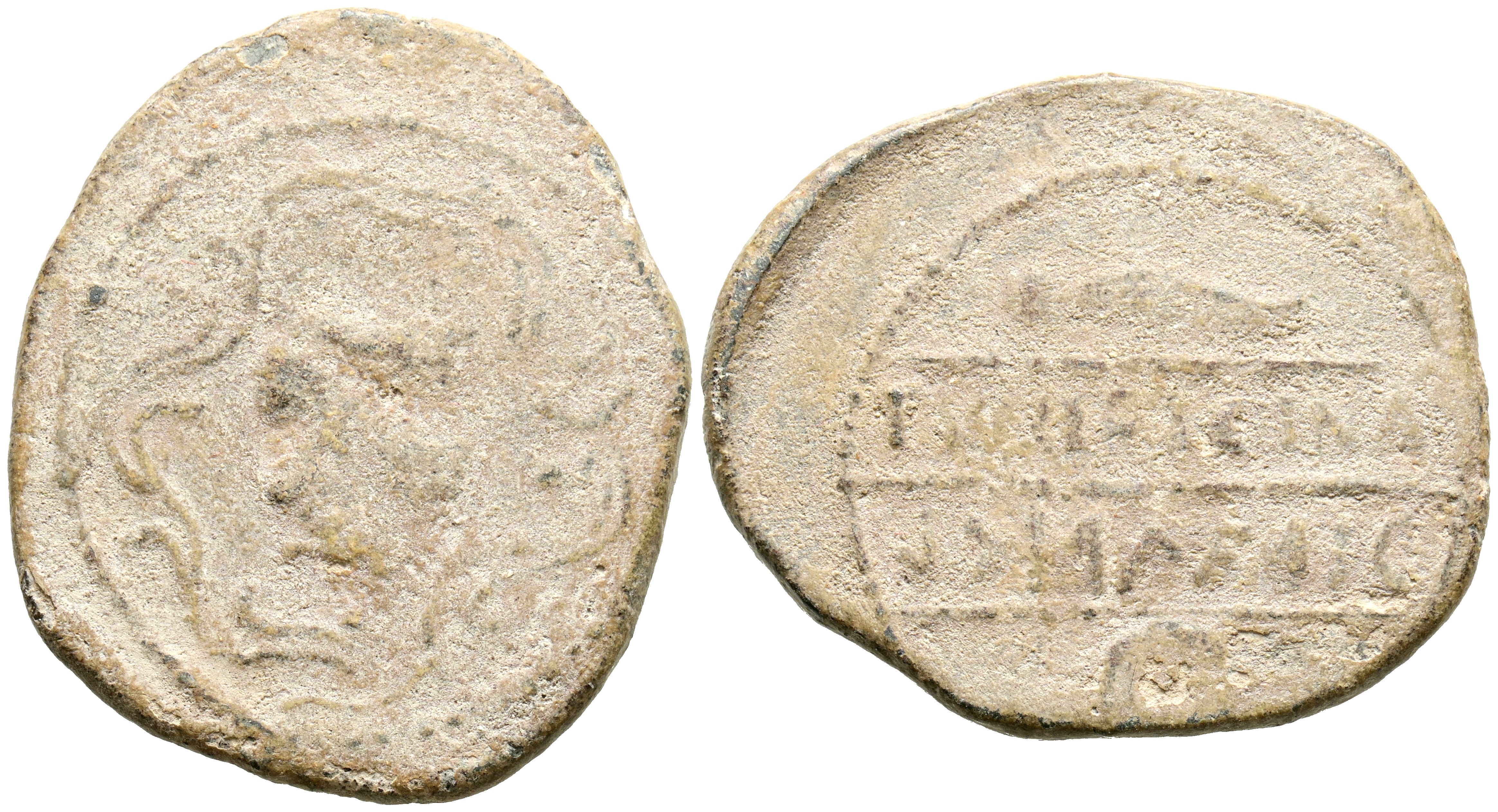 TURRIREGINA (Casas de Reina, Badajoz). Plomo monetiforme. (Pb. 21,72g/35mm). 50 a.C. (CCP no cita). Anv: Cabeza con casco a derecha dentro de corona de tallos de vid. Rev: Leyenda: TVRIRIICINA y leyenda libio-fenicia, entre falcata y rodela. BC+. Escaso ejemplar.