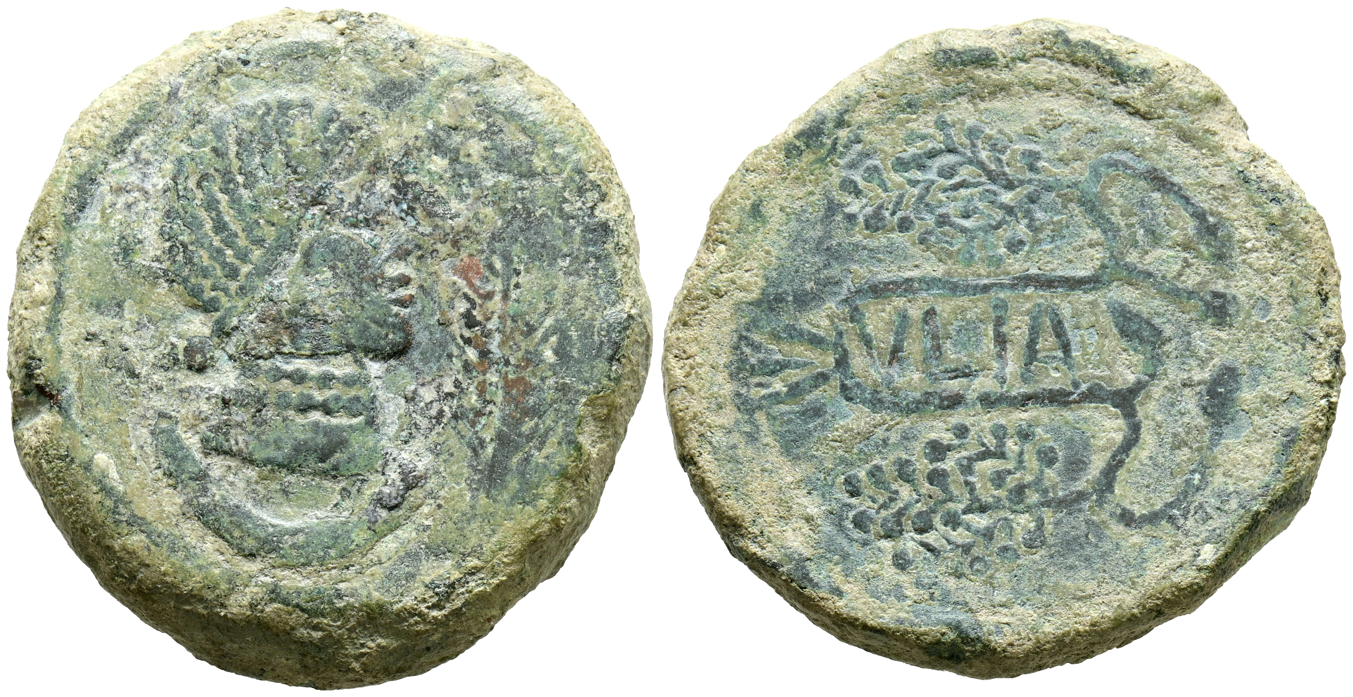 ULIA (Montemayor, Córdoba). As. (Ae. 26,91g/32mm). 50 a.C. (FAB-2490). Anv: Cabeza femenina a derecha, delante palma, debajo creciente. Rev: Ramas de vid alrededor de cartela con leyenda: VLIA. MBC.