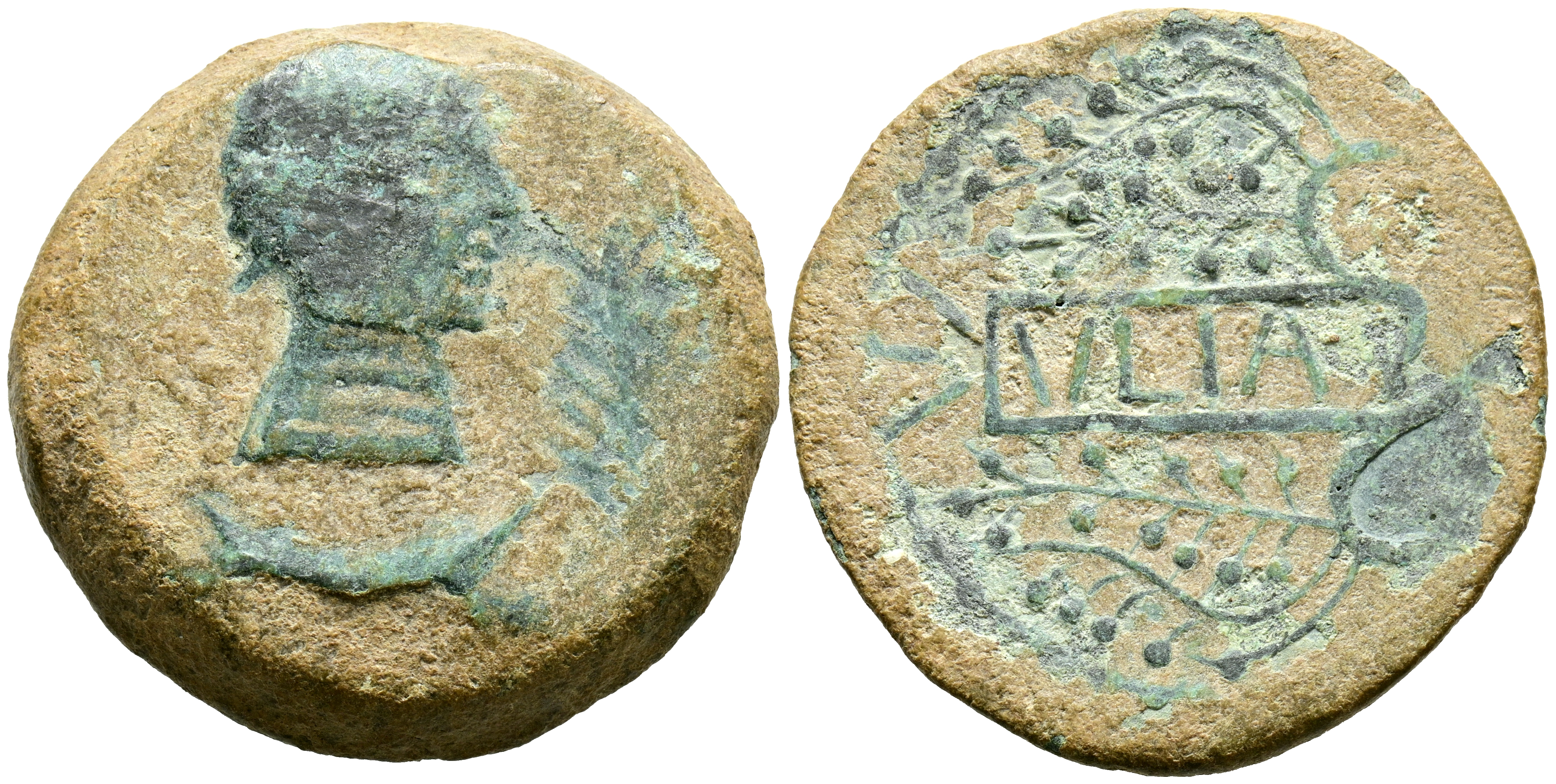 ULIA (Montemayor, Córdoba). As. (Ae. 24,16g/34mm). 50 a.C. (FAB-2492). Anv: Cabeza femenina a derecha, delante espiga, debajo creciente. Rev: Ramas de vid alrededor de cartela con leyenda: VLIA. MBC-.