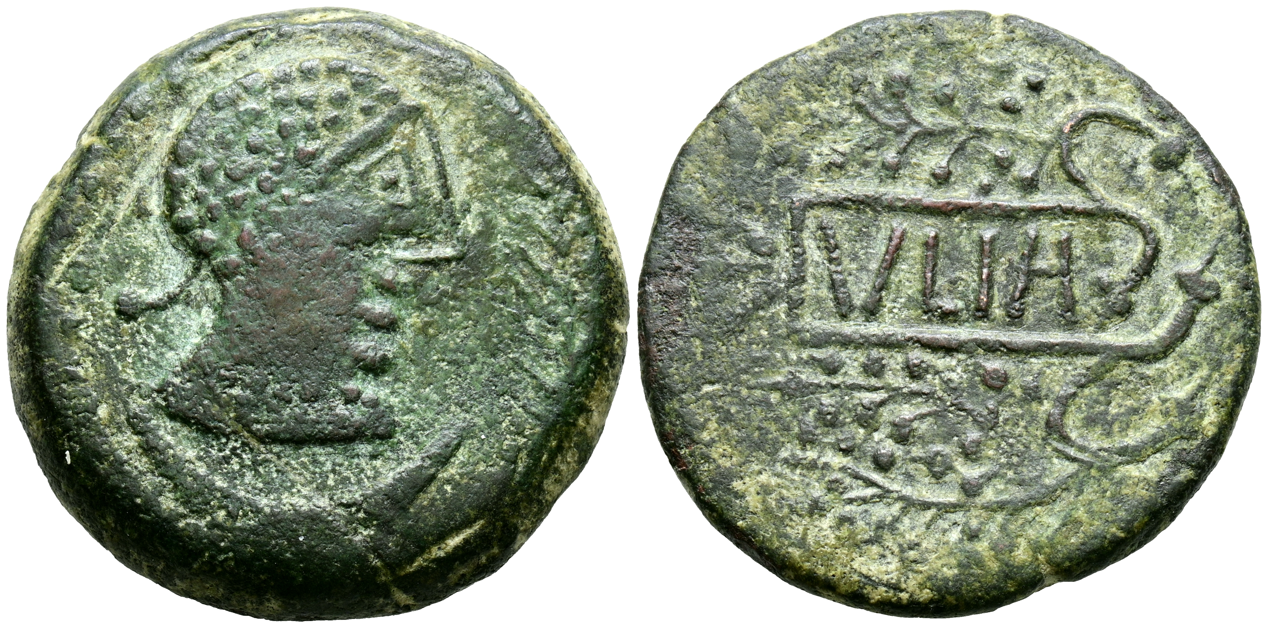 ULIA (Montemayor, Córdoba). As. (Ae. 21,51g/31mm). 50 a.C. (FAB-2492). Anv: Cabeza femenina a derecha, delante espiga, debajo creciente. Rev: Ramas de vid alrededor de cartela con leyenda: VLIA. MBC-.