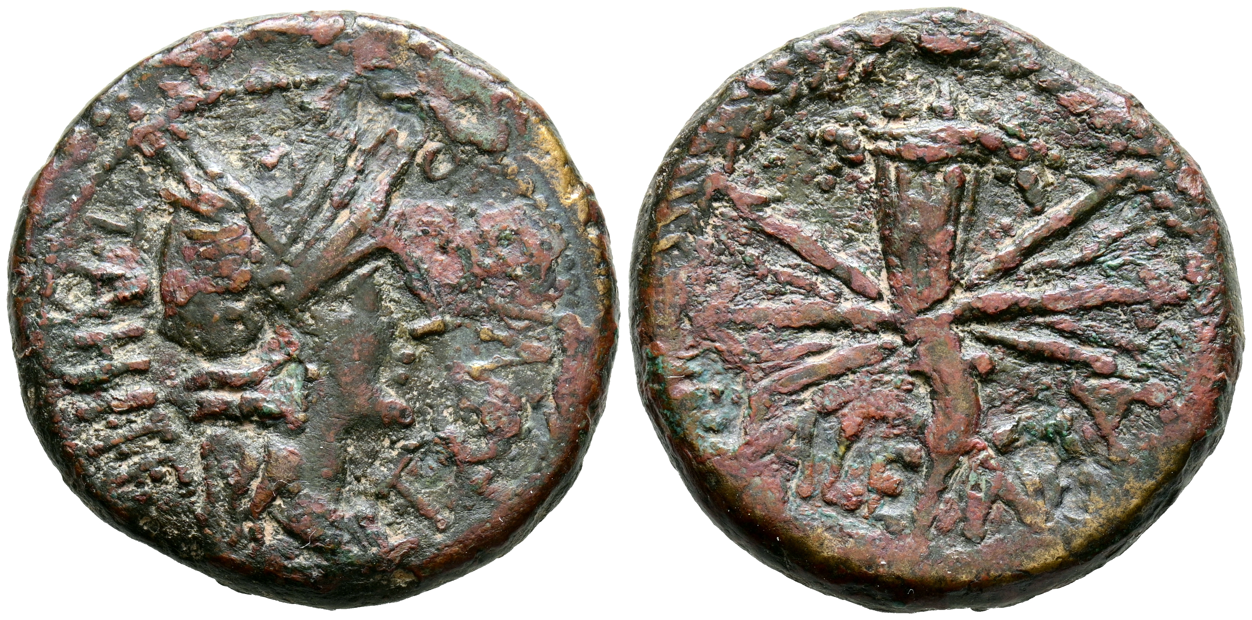 VALENTIA (Valencia). As. (Ae. 19,73g/30mm). 150-50 a.C. (FAB-2512). Anv: Cabeza galeada de Roma a derecha, alrededor leyenda: TAHI T F Y L TRINI L F Q. Rev: Cornucopia sobre haz de rayos, debajo leyenda: VALENTIA, todo dentro de láurea. MBC-.