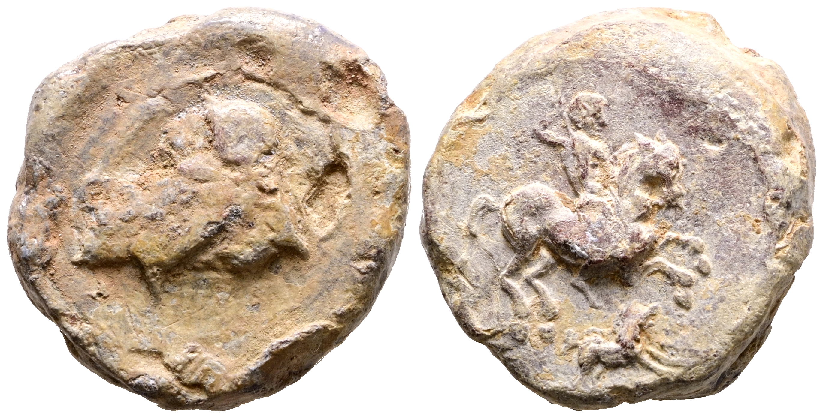 SERIE DE ATENEA Y VICTORIA. Plomo monetiforme. (Pb. 24,66g/26mm). (CCP pág. 23, nº 5, catalogado como RR). Anv: Cabeza de Atenea con casco a derecha. Rev: Jinete con lanza a derecha, debajo: perro. MBC-/MBC. Raro ejemplar.