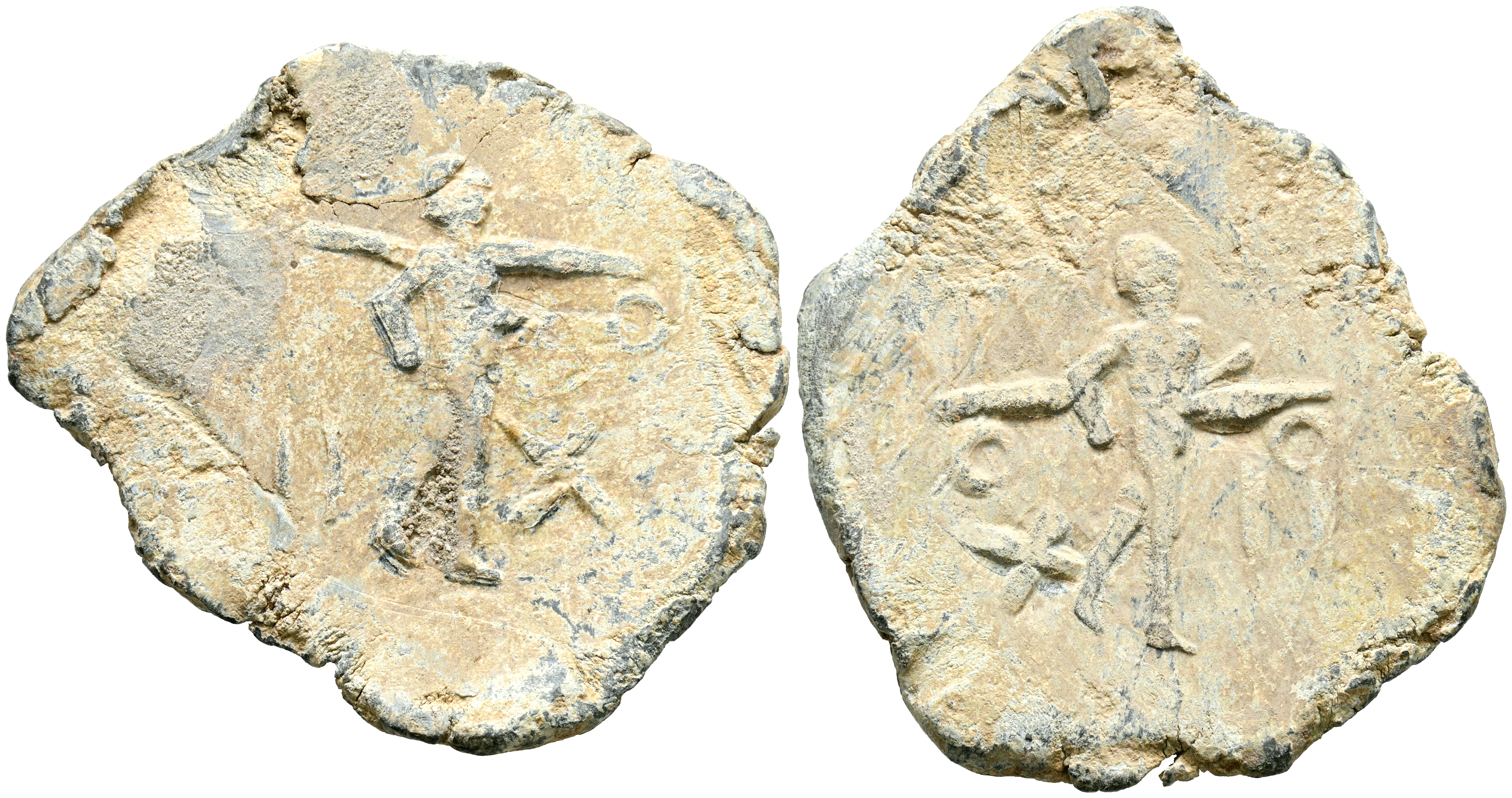 SERIE DE LAS MINAS. Plomo monetiforme. (Pb. 29,35g/44mm). (CCP no cita). Anv: Figura masculina avanzando a derecha portando herramienta entre O/X-O/II. Rev: Figura masculina avanzando a derecha entre: II-X. MBC.