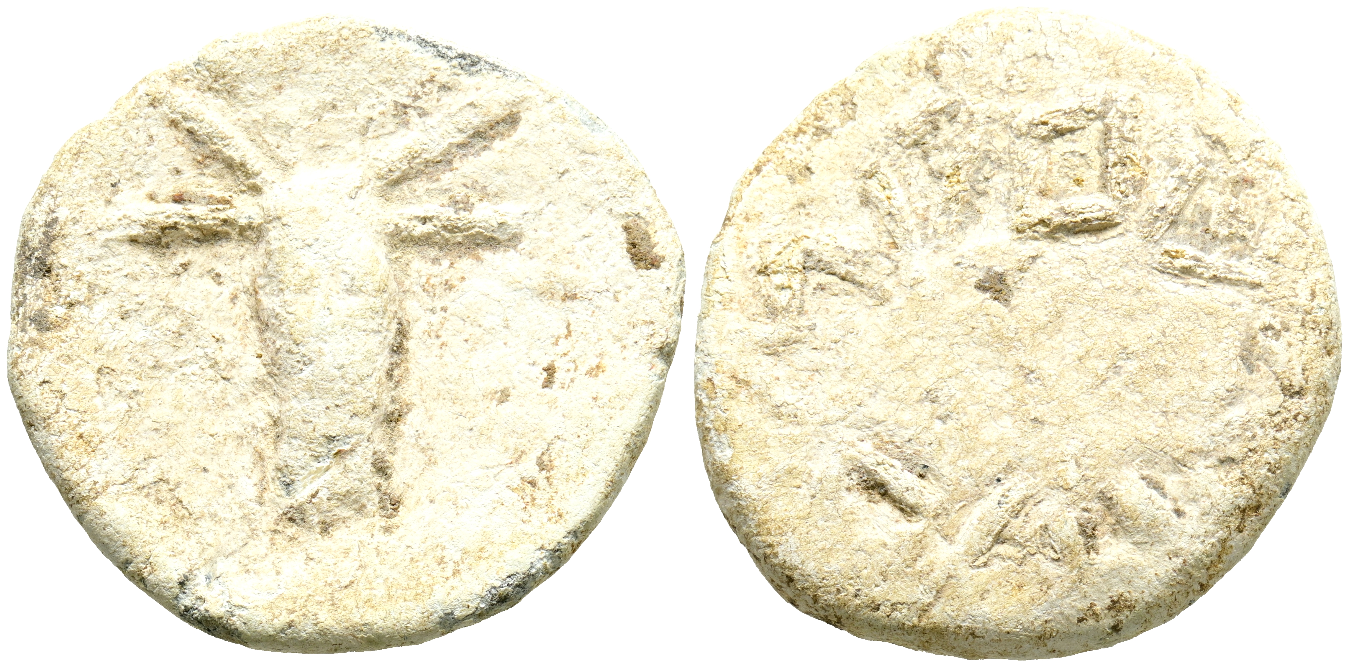 Plomo monetiforme. (Pb. 18,64g/33mm). Anv: Cabeza de toro de fente. Rev: Leyenda circular en caracteres ibericos. Rarísima e inédita.