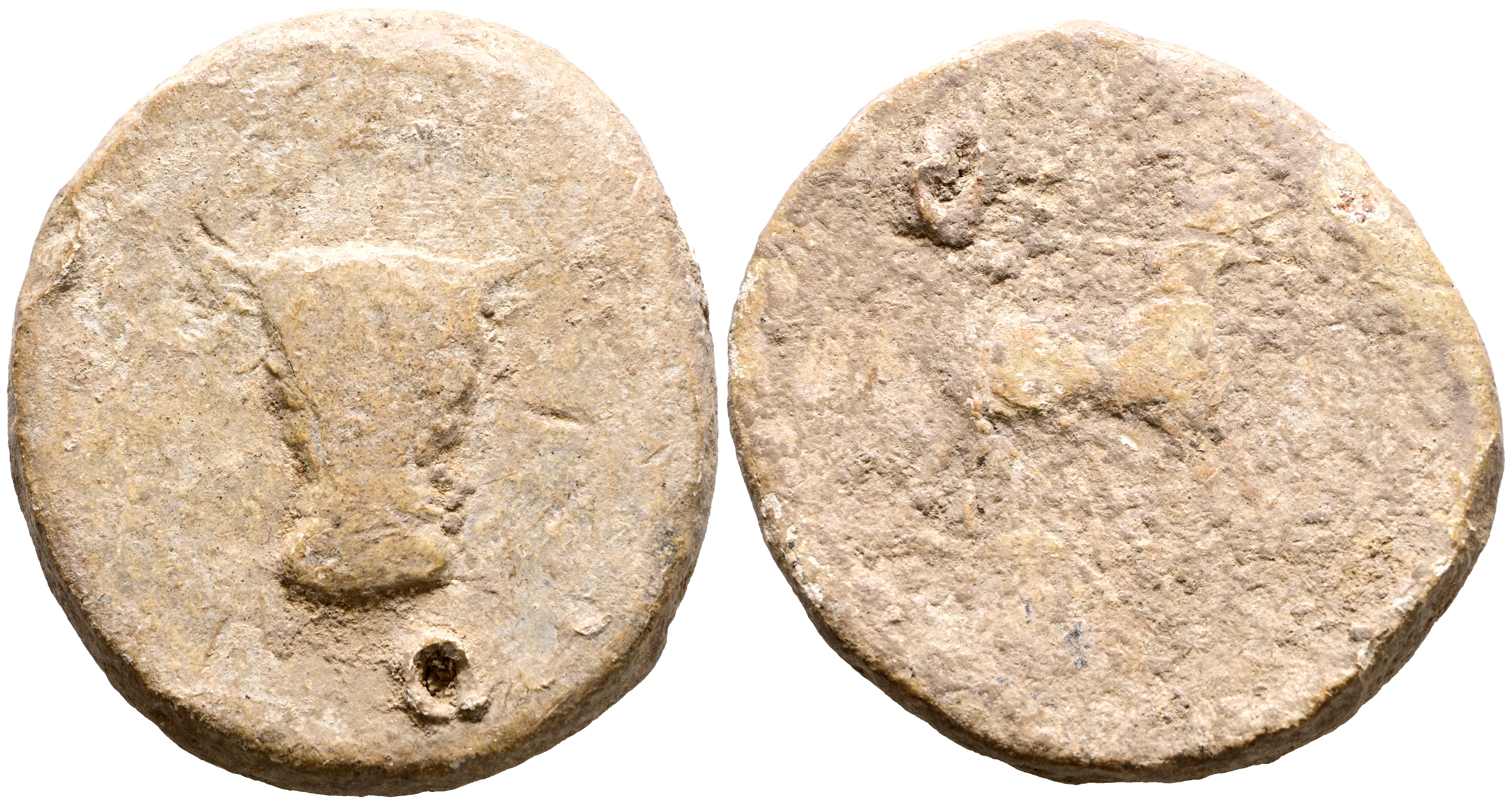 SERIE DE LAS MINAS. Plomo monetiforme. (Pb. 87,00g/45mm). (CCP similiar a pág. 28-29). Anv: Cabeza de toro de frente, dentro de corona de laurel. Rev: ¿Caballo o jabalí?, a derecha dentro de láurea. BC. Perforación.