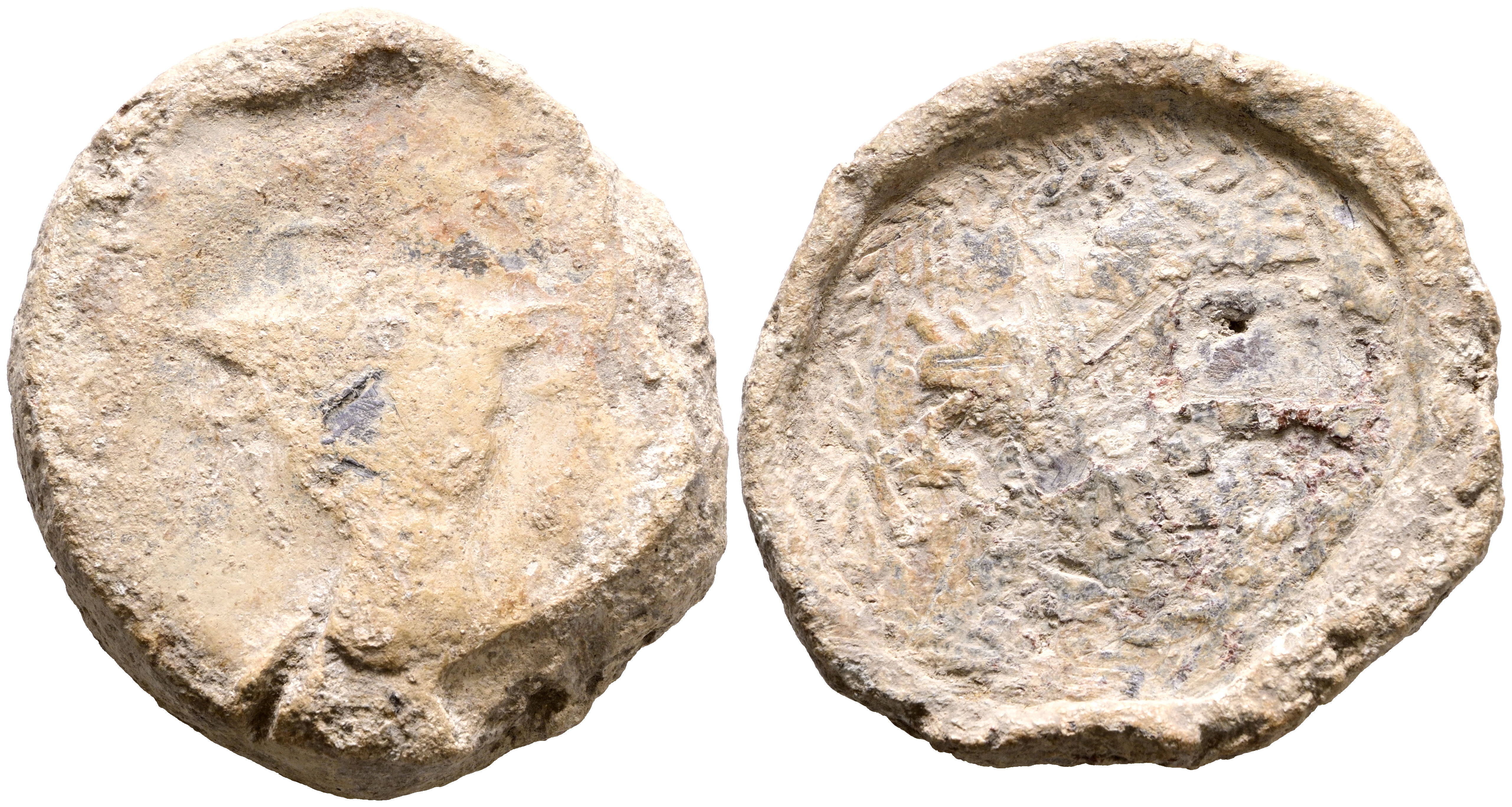 SERIE DE LAS MINAS. Plomo monetiforme. (Pb. 120,37g/49mm). (CCP similiar a pág. 28-29). Anv: Cabeza de toro de frente, dentro de corona de laurel. Rev: ¿Caballo o jabalí?, a derecha dentro de láurea. BC.