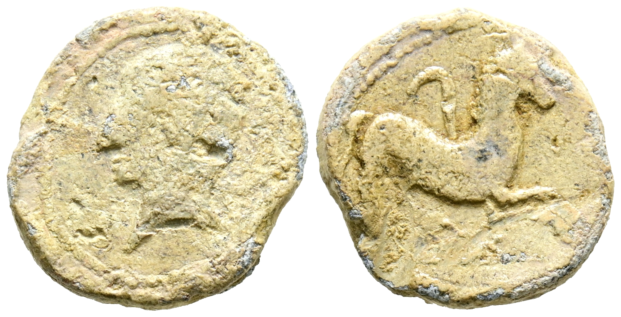 PLOMO INCIERTO. Plomo monetiforme. (Pb. 3,50g/15mm). (CCP no cita). Anv: Cabeza masculina a izquierda. Rev: Caballo a derecha, encima: aspérgilo. MBC-. Escaso ejemplar.
