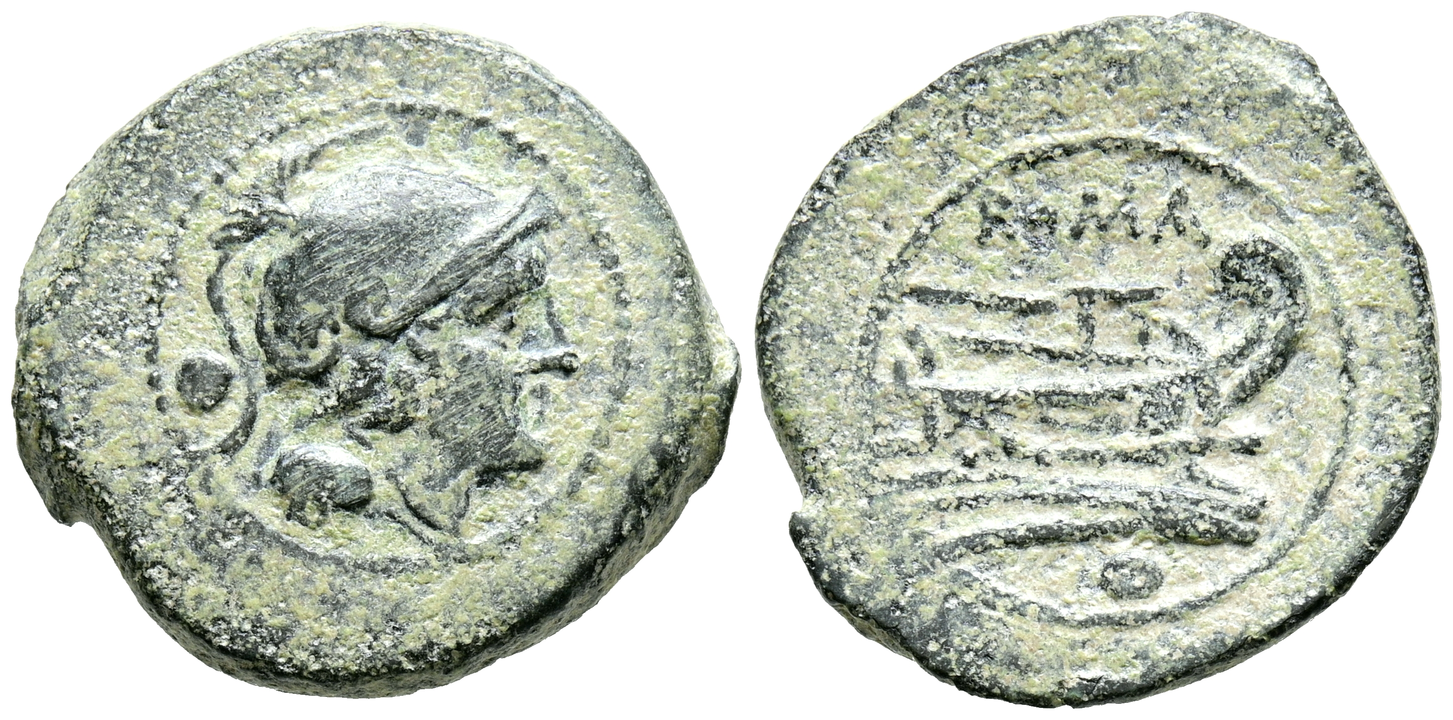 ACUÑACIONES ANONIMAS. Uncia. (Ae. 4,91g/21mm). 217-215 a.C. Roma. (Crawford 41/10). Anv: Cabeza de Roma a derecha, detrás punto. Rev: Proa a derecha, encima leyenda: ROMA, debajo punto. MBC+. Interesante ejemplar.