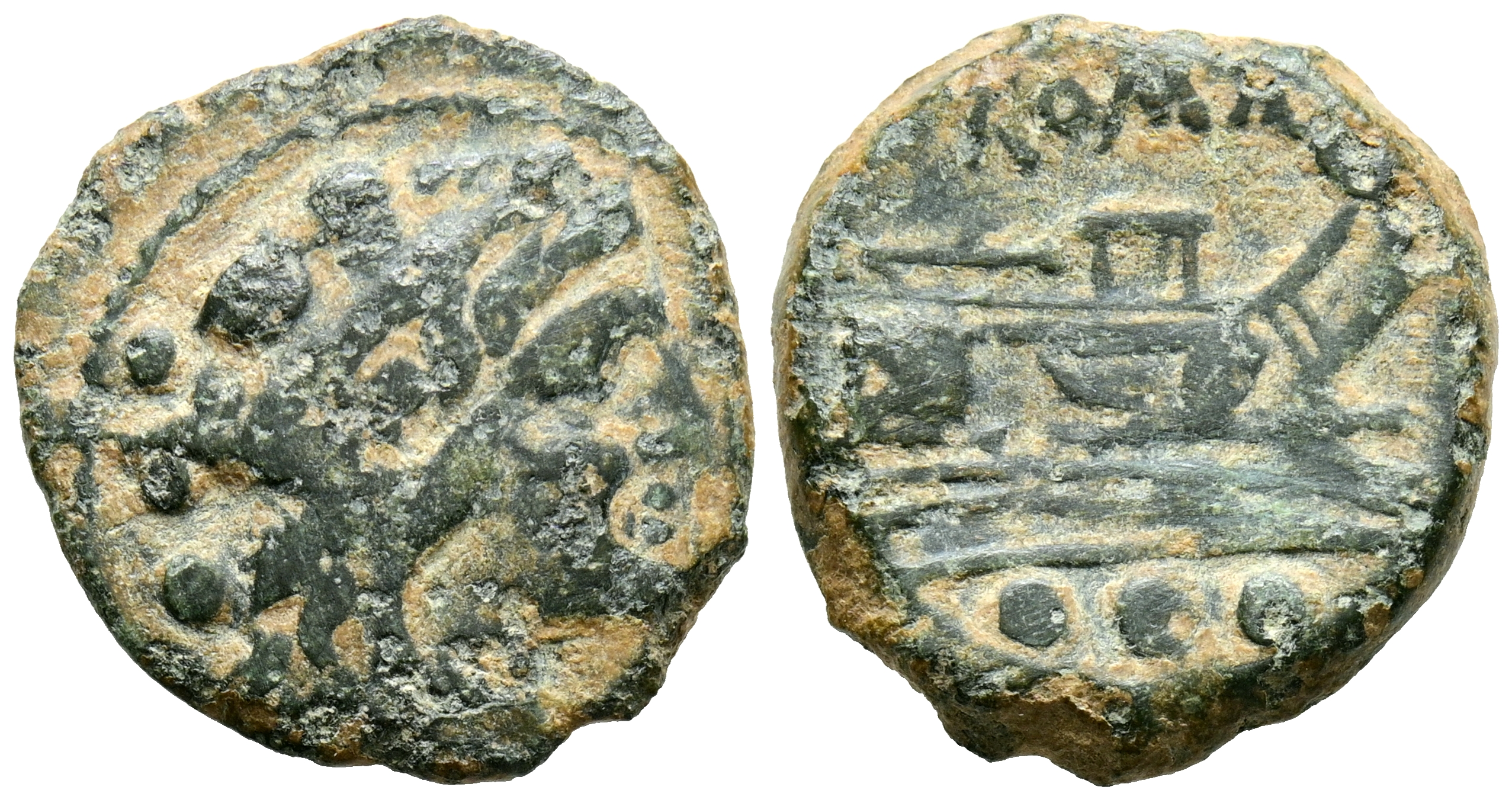 ACUÑACIONES ANONIMAS. Cuadrante. (Ae. 4,75g/18mm). 211 a.C. Roma. (Crawford 56/5). Anv: Cabeza de Heracles con piel de león a derecha, detrás tres puntos. Rev: Proa a derecha, debajo tres puntos, encima: ROMA. MBC-.