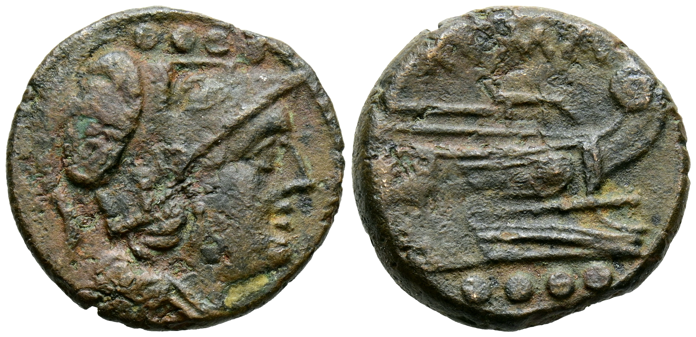ACUÑACIONES ANONIMAS. Triente. (Ae. 5,86g/20mm). 211 a.C. Ceca incierta. (Crawford 56/4). Anv: Cabeza de Roma con casco a derecha, encima de cuatro puntos. Rev: Proa a derecha, encima: ROMA, debajo cuatro puntos. MBC-.