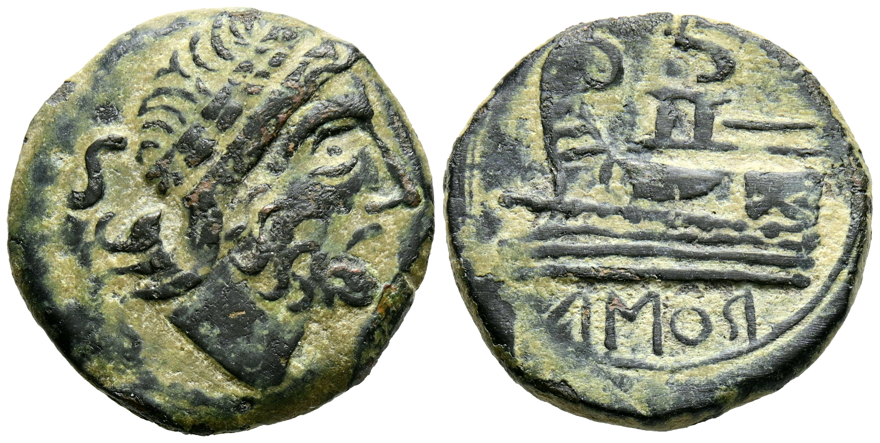 ACUÑACIONES ANONIMAS. Semis. (Ae. 6,46g/20mm). 211 a.C. Incierto. Imitación Hispana. (Crawford 56/3). Anv: Cabeza laureada de Saturno a derecha; detrás S. Rev: Proa a izquierda; encima S, debajo leyenda retrógrada: ROMA. MBC+.