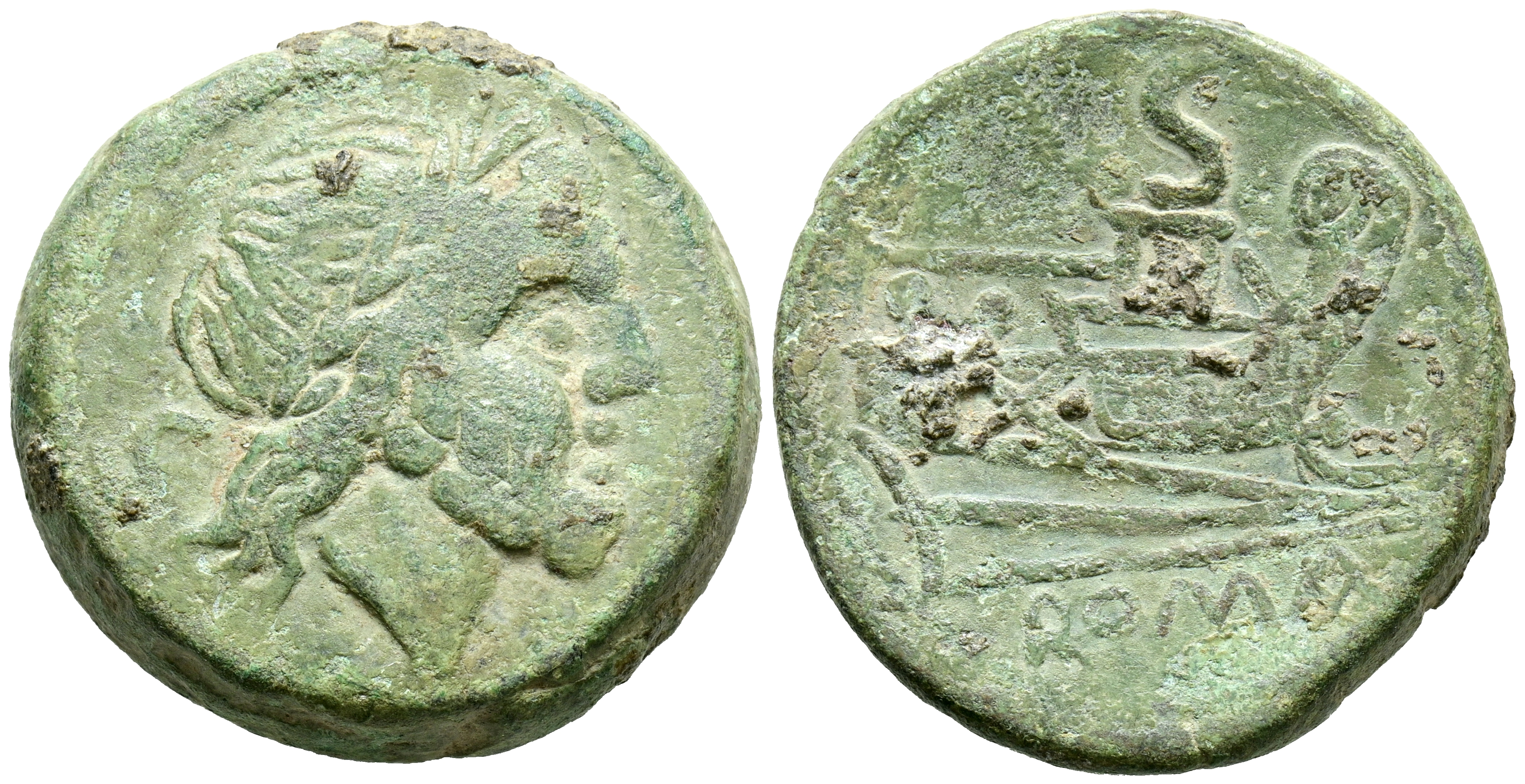 ACUÑACIONES ANONIMAS. Semis. (Ae. 20,11g/28mm). 211 a.C. Roma. (Crawford 56/3). Anv: Cabeza laureada de Saturno a derecha, detrás S. Rev: Proa a derecha, encima S, debajo leyenda: ROMA. MBC+. Atractivo ejemplar.