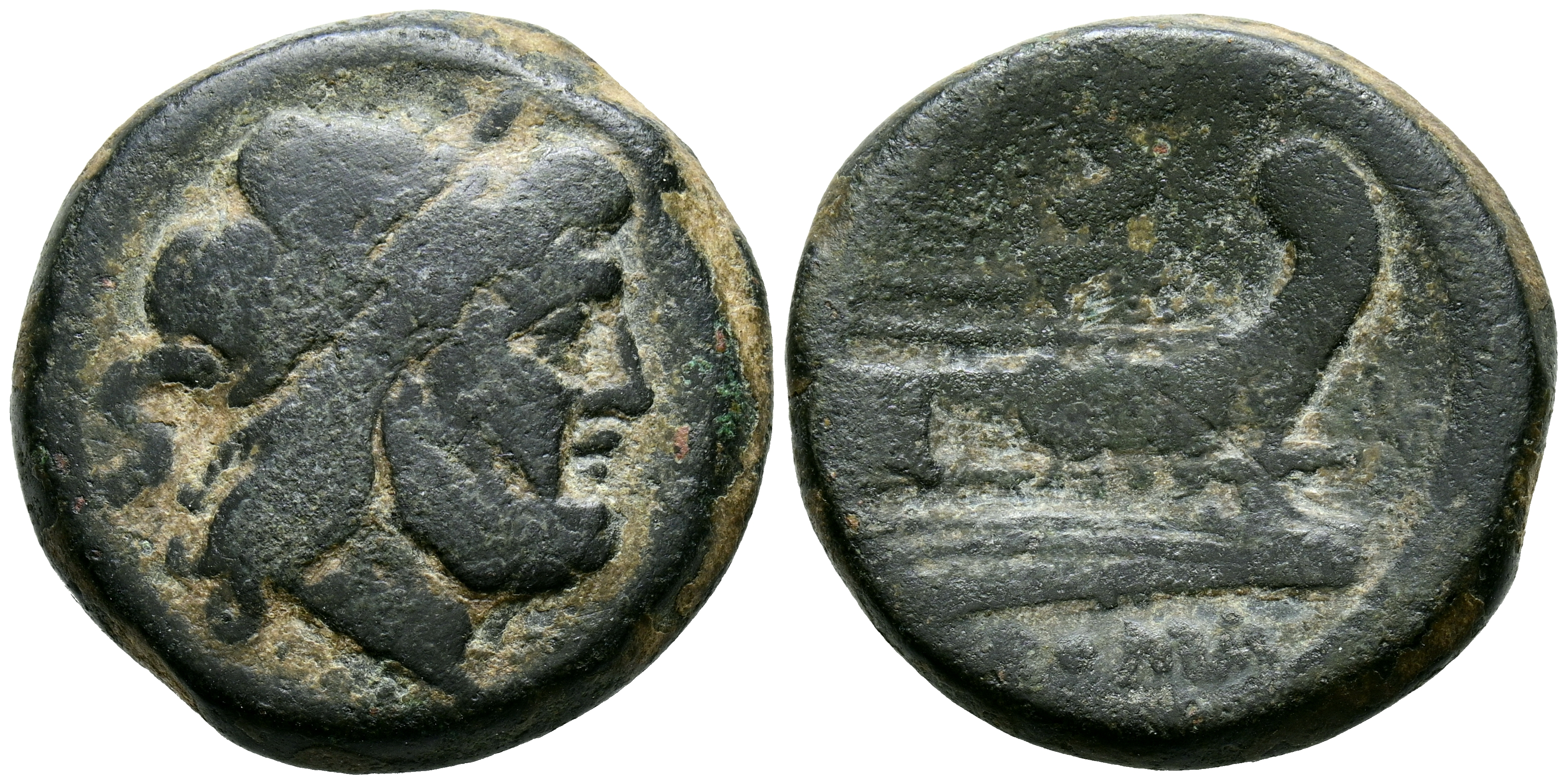 ACUÑACIONES ANONIMAS. Semis. (Ae. 17,02g/27mm). 211 a.C. Roma. (Crawford 56/3). Anv: Cabeza laureada de Saturno a derecha, detrás S. Rev: Proa a derecha, encima S, debajo leyenda: ROMA. BC+.