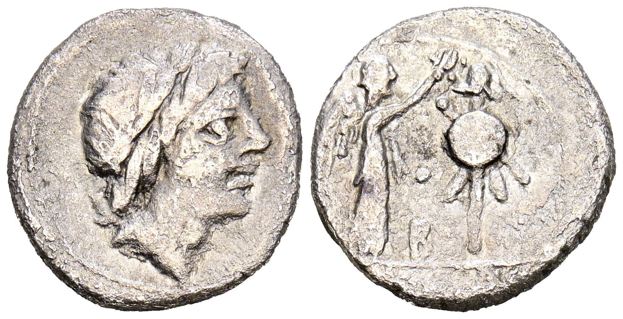 ANÓNIMO. Quinario. (Ar. 1,70g/14mm). 81 a. C. Ceca incierta. (Crawford 373/1b). Anv: Cabeza laureada de Apolo a la derecha. Rev: Victoria estante a la derecha, coronando el trofeo con una corona; en el centro inferior, B, en exergo: ROMA. MBC-.
